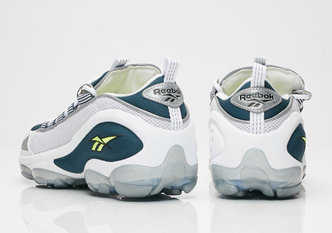 鞋款以湖蓝与白色为主调,点缀的 Reebok Logo 以荧光黄色点缀,配色风格就十分复古。鞋款通过分散在中底各处的十个连通气囊来达到气压缓震的效果,达到的澎湃脚感相信让不少老玩家都印象深刻!