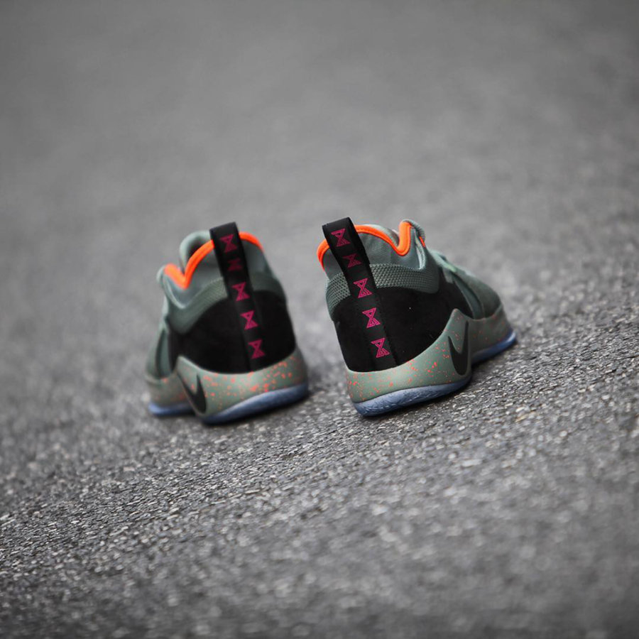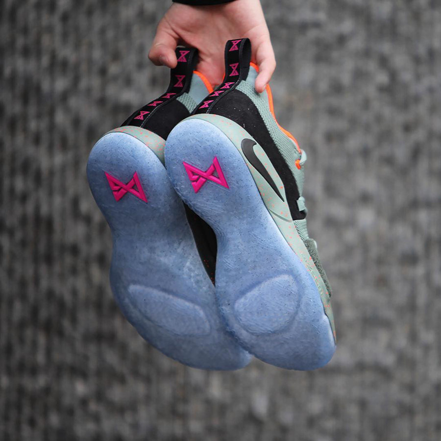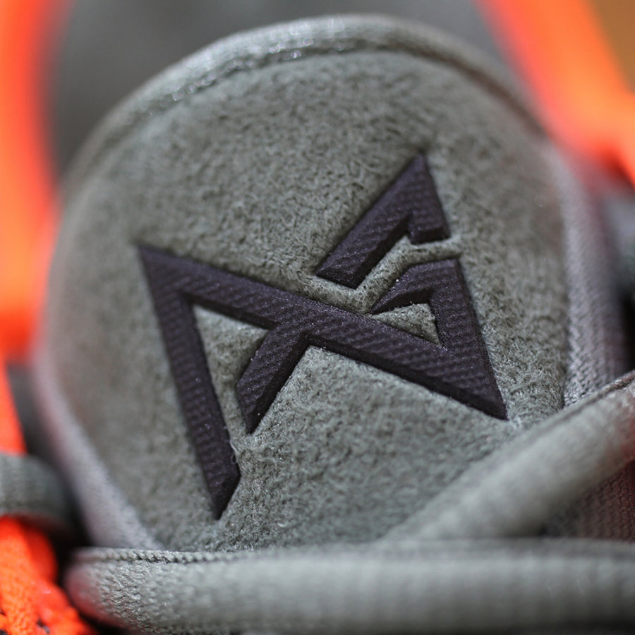 本次配色设计方案以乔治家乡 Palmdale 为灵感,选用沉稳的灰绿色结合黑色装扮打造鞋身,内衬及中底泼墨元素注入醒目的亮橙色调点缀,最后辅以冰蓝水晶大底收尾,营造出别具一格的新颖视觉体验,想必上脚效果一定不俗!