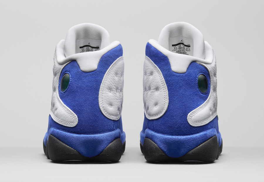 采用同白红 Air Jordan 13 “Chicago” 相同的配色布局,大面积白色优质皮革覆盖鞋身,麂皮部分使用皇家蓝替代了红色,后跟点缀标致性的绿色豹眼,搭配黑色中底收尾。