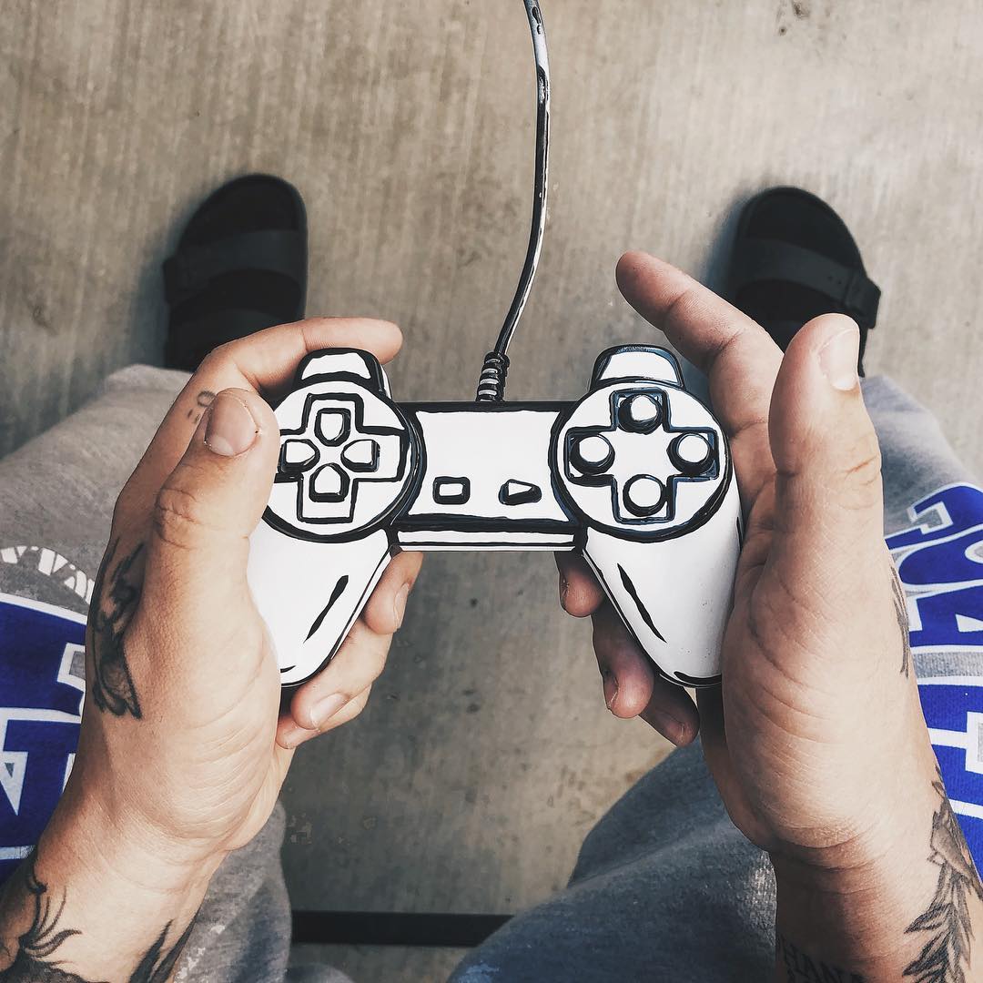 除了球鞋,Joshua 还毫不手软的对自己的 Beats 耳机和 PlayStation 手柄下手,还把交通警示标、Supreme 钞票枪、凳子等实物 “压缩” 成了二次元。