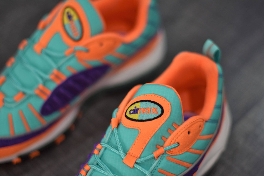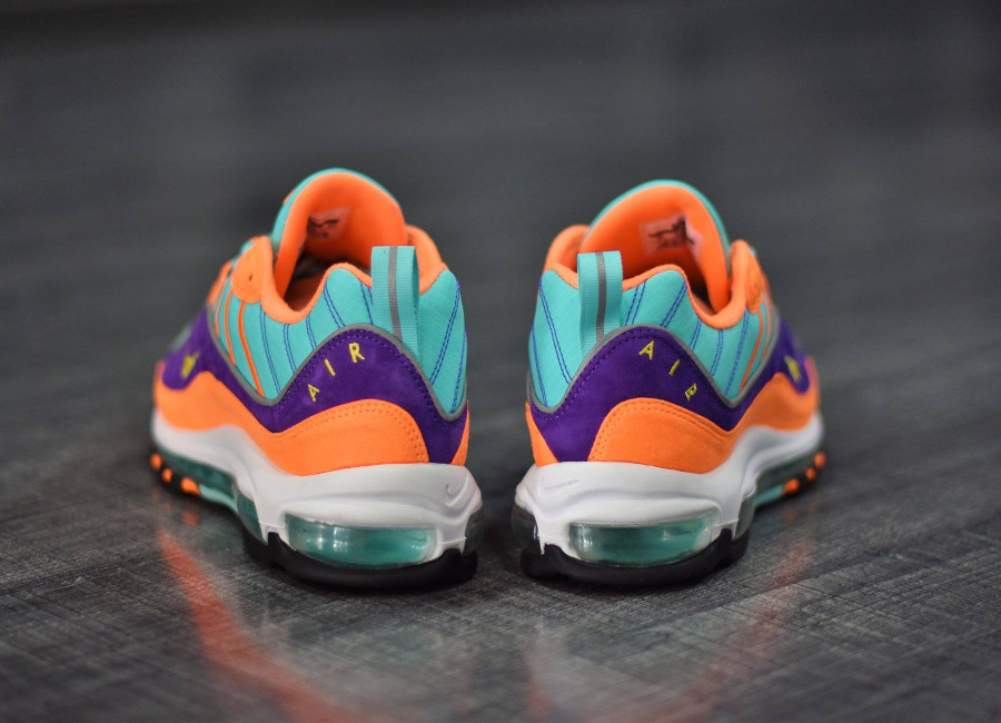 采用了多个亮眼色调拼接呈现,以橙色和葡萄紫勾勒 Air Max 98 的经典轮廓线条,鞋领部分更是选用了薄荷绿带来小清新感受。