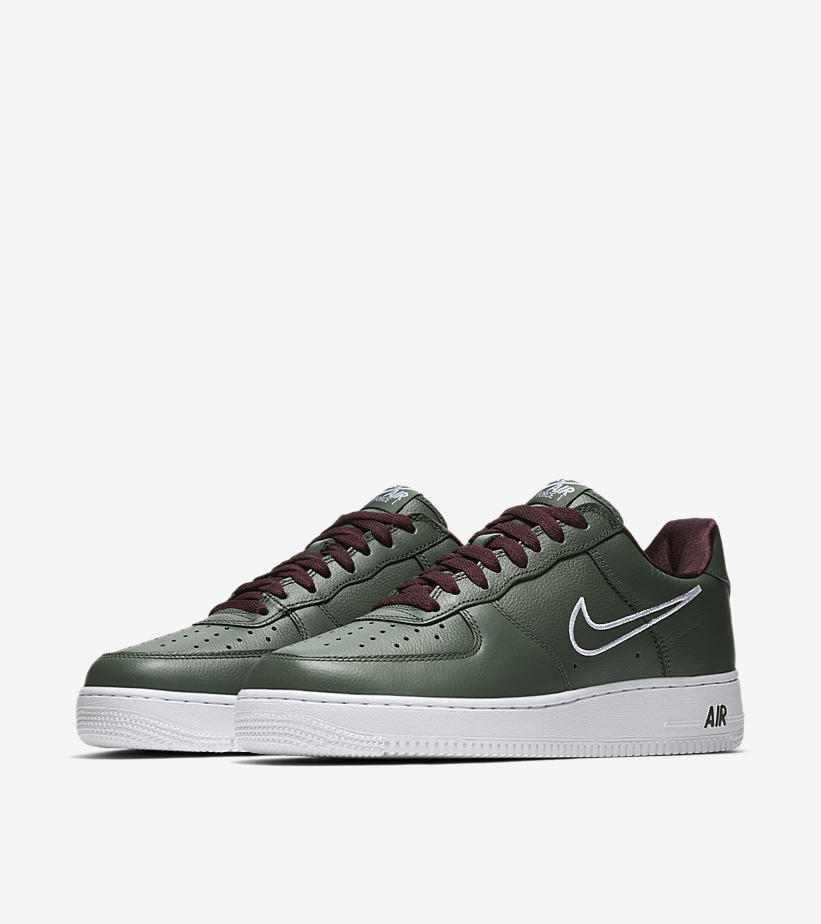 暗森林绿色调的皮革鞋面质感细腻,中间留空的刺绣 Swoosh 方式更是特别!