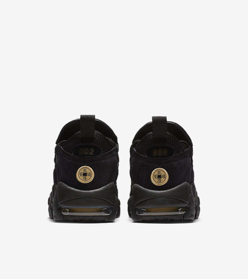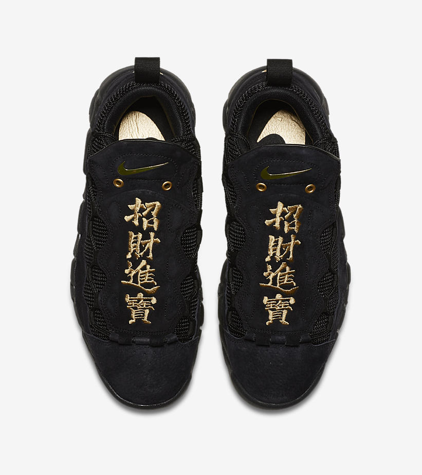 今天大年初五,Nike 也突击发售了一款同主题的新品鞋款,这双 Nike Air More Money “LNY” 本来就以 “More Money” 作为主题,此番结合了中国传统节日,鞋面上金色的 “招財進寶” 字样,和后跟的 “乾隆通寶” 钱币标志都颇具中国风气质。