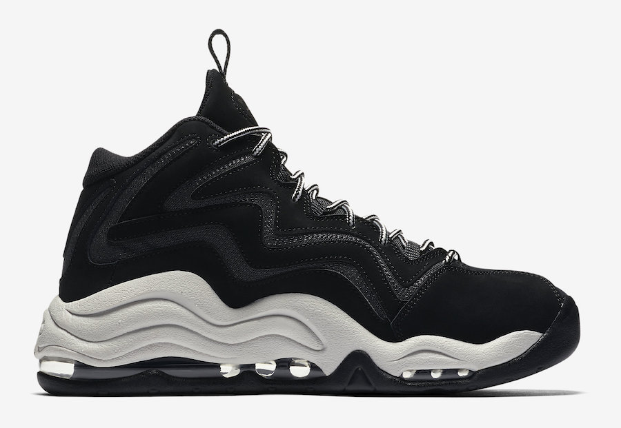 鞋款以黑白两色为主调,细节中加入深灰色作为点缀,质感不错的黑色牛巴革搭配线条颇为夸张的白色中底,将这双经典篮球鞋演绎出低调的复古风格。
