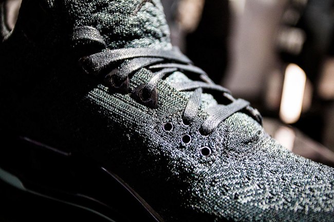 整体采用纯黑的配色方案打造而成,鞋面部分包括爆裂纹在内全部使用 Flyknit 编织材质打造,搭配淡绿色水晶外底收尾,并且带有夜光功能!