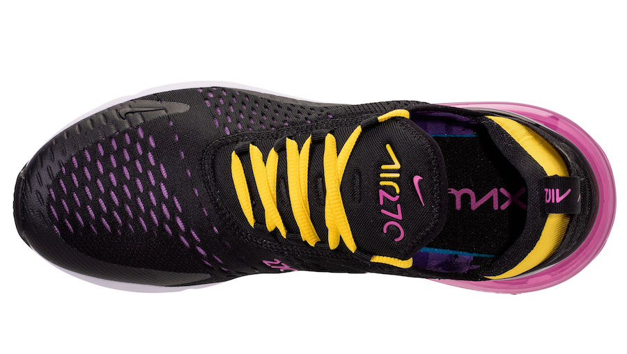 鞋款以黑色为主调,后跟的 Air Max 气垫与鞋身 Swoosh Logo 则以粉色呈现,鞋带与后跟则加入亮眼的黄色点缀,鞋舌处的 “AIR270” 同样使用黄色与粉色拼接,极为耐看亮眼。
