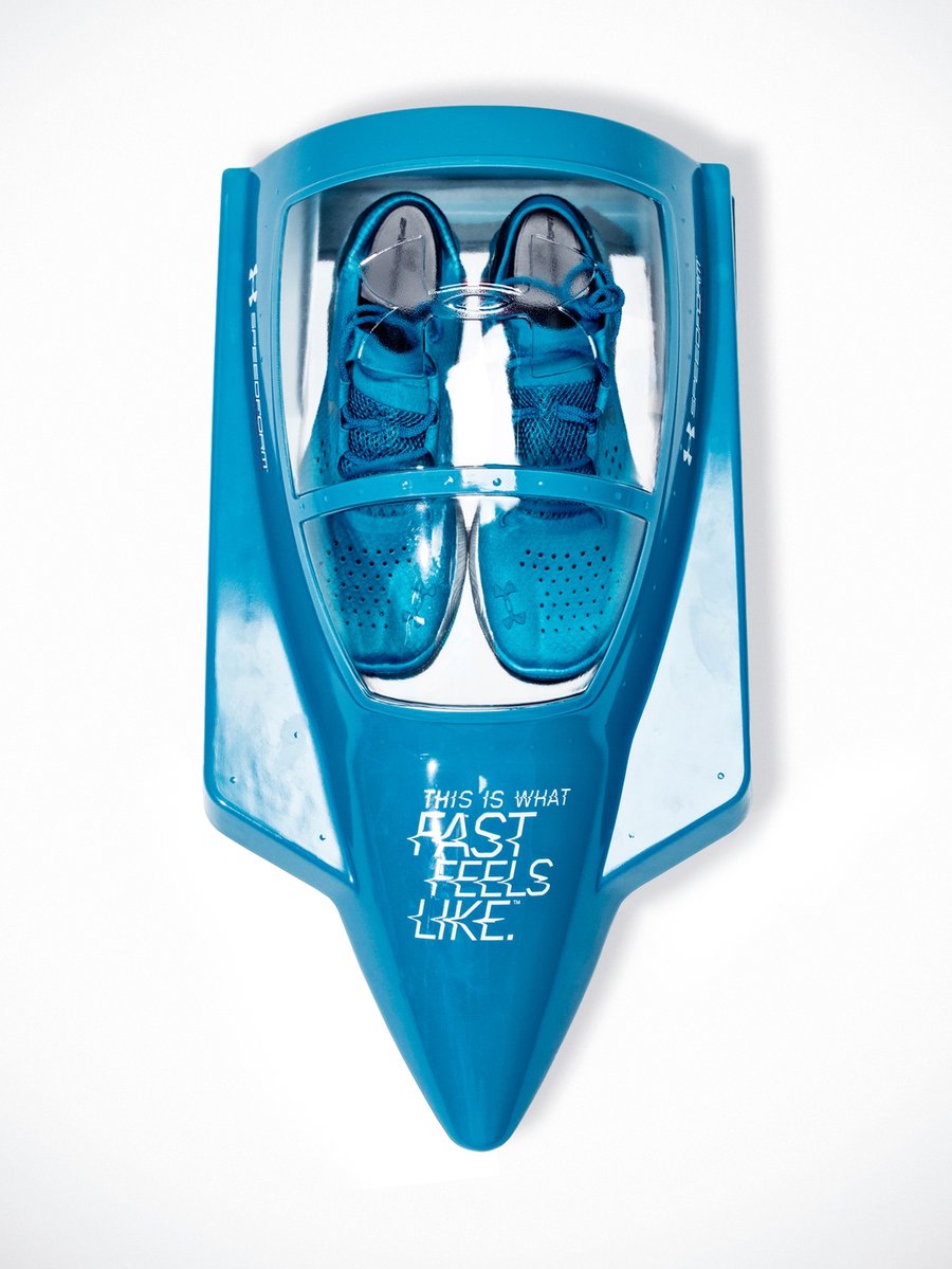 为契合登月主题,特别打造一组飞行器造型包装,不仅在座舱处显现 Speedform Apollo 鞋款本体,U 盘及主题T恤更暗藏其中,以此彰显轻盈、迅敏的鞋身特性,可谓创意十足。