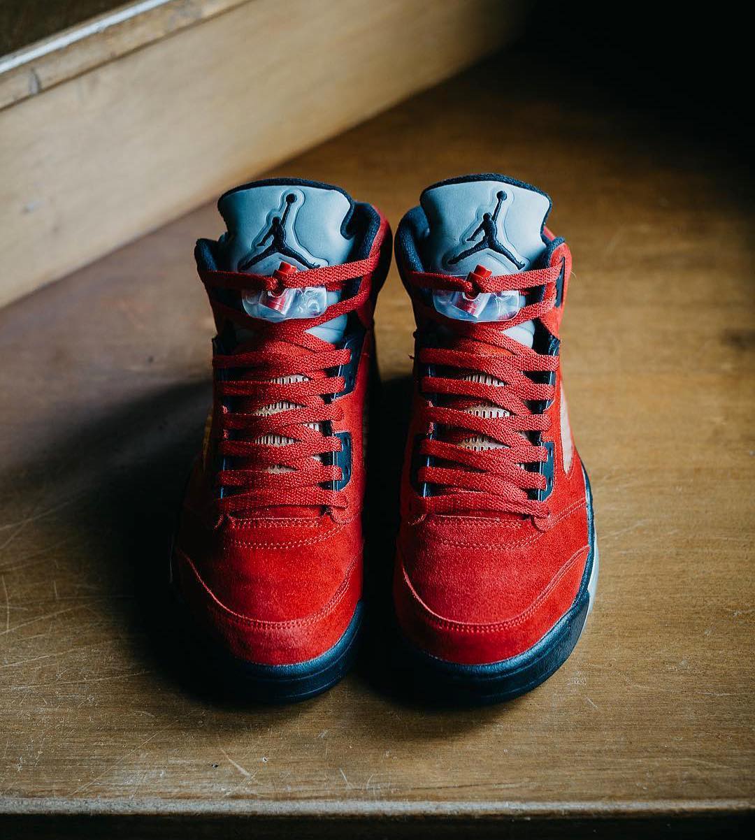 在 2009 年以 DMP 套装的形式发售,一黑一红两双鞋都极为经典,相比之下这双大红麂皮配色的人气更胜一筹,虽然在去年有一双全新的 Air Jordan 5 “Red Suede” 与其相似,但在不少人心中愤怒的公牛绝对不可能被替代!