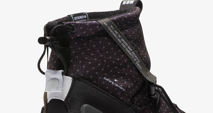 鞋款设计注重功能性与机能感,高帮袜套与醒目的 Swoosh Logo 则有一种 “吕布” 的既视感,鞋带系统使用鞋扣松紧收缩设计,左右脚以鸳鸯的形式呈现,首发的两款配色分别为黑曜石与军绿色。