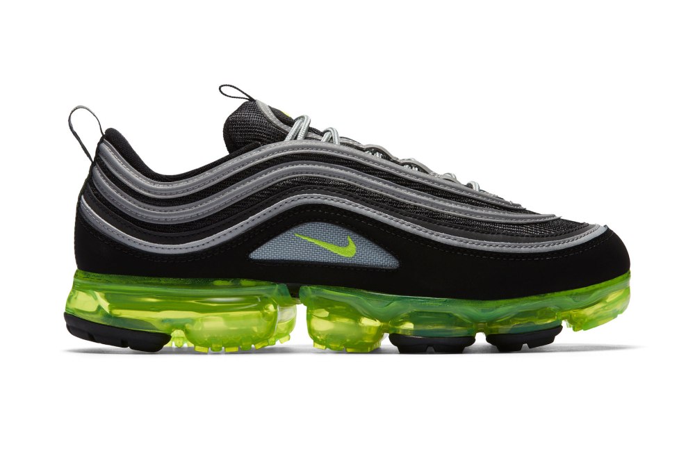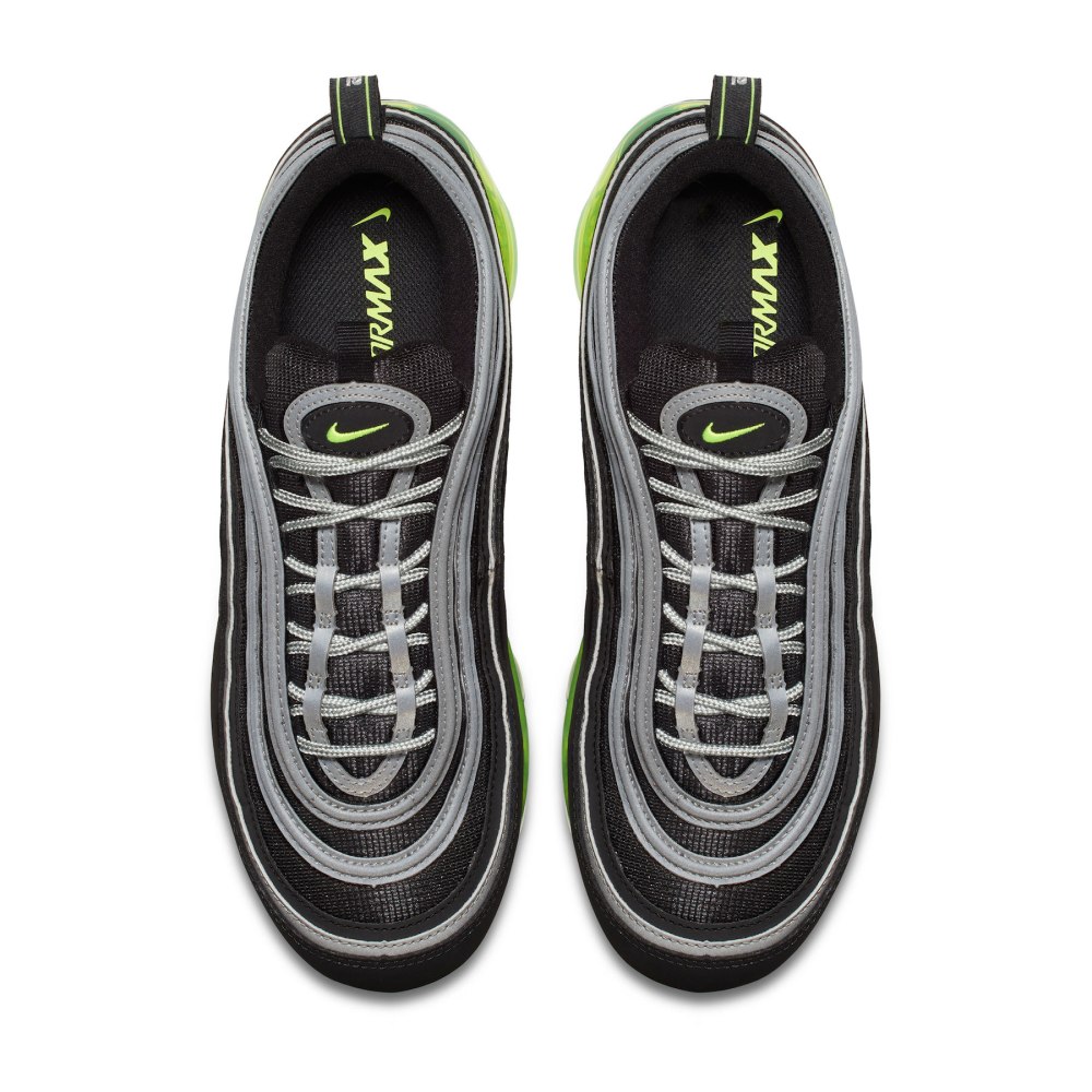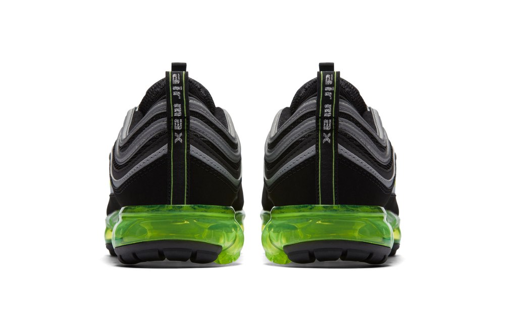 设计将经典鞋型 Air Max 97 的子弹头鞋面,与去年推出的全新鞋型 Air VaporMax 的全掌气垫相结合,不仅是复古与前卫的结合,更是经典与创新的结合,首发配色以经典的 “Neon” 配色极为相似,黑、灰、绿三色的搭配更显复古潮流。
