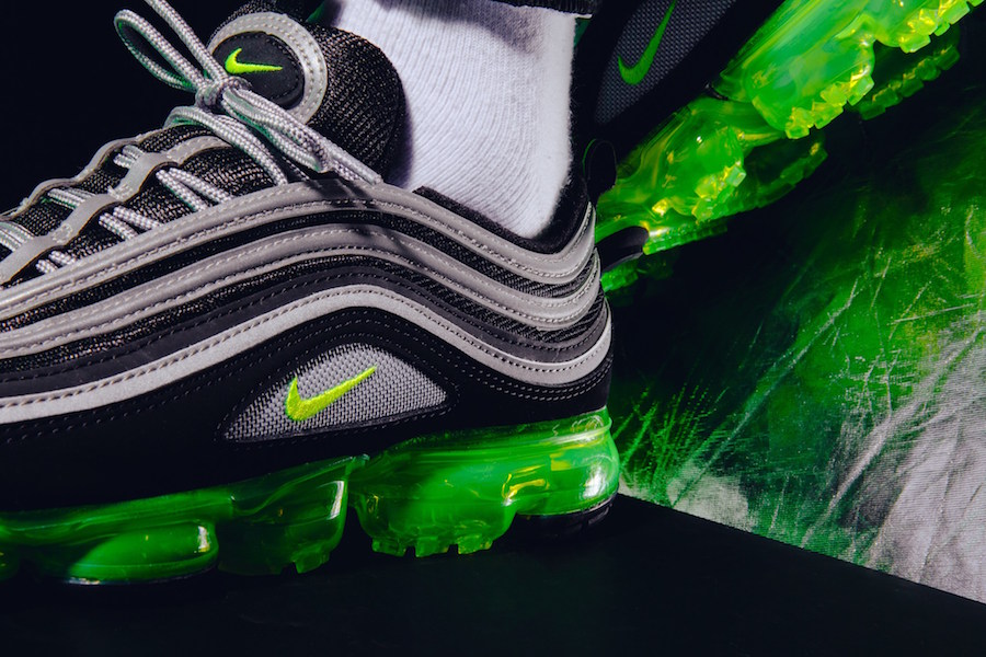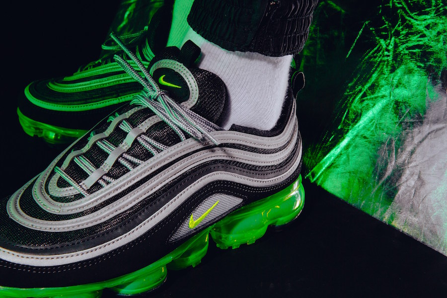 设计将经典鞋型 Air Max 97 的子弹头鞋面,与去年推出的全新鞋型 Air VaporMax 的全掌气垫相结合,不仅是复古与前卫的结合,更是经典与创新的结合,首发配色以经典的 “Neon” 配色极为相似,黑、灰、绿三色的搭配更显复古潮流。