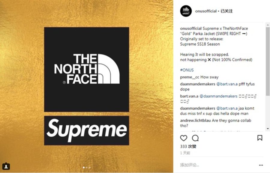根据情报账号 @onusofficial 在 Instagram 上发布的信息称,原来设定将在 2018 春夏发布的 Supreme x TNF 金色冲锋衣也许将被放弃!到底会不会发售,有兴趣的小伙伴不妨多多关注我们的后续报道!
