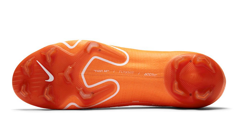 配色方案与之前 OFF-WHITE 主理人 Virgil Abloh 上脚过的 Mercurial Vapormax Hybrid 鞋款如出一辙,橙色主体配以白蓝两色的波点,同时保留了标志性的白色说明字体,Vapormax 中底则被替换为橙色半透明鞋钉,相信这款球鞋将成为世界杯赛场上的明星!
