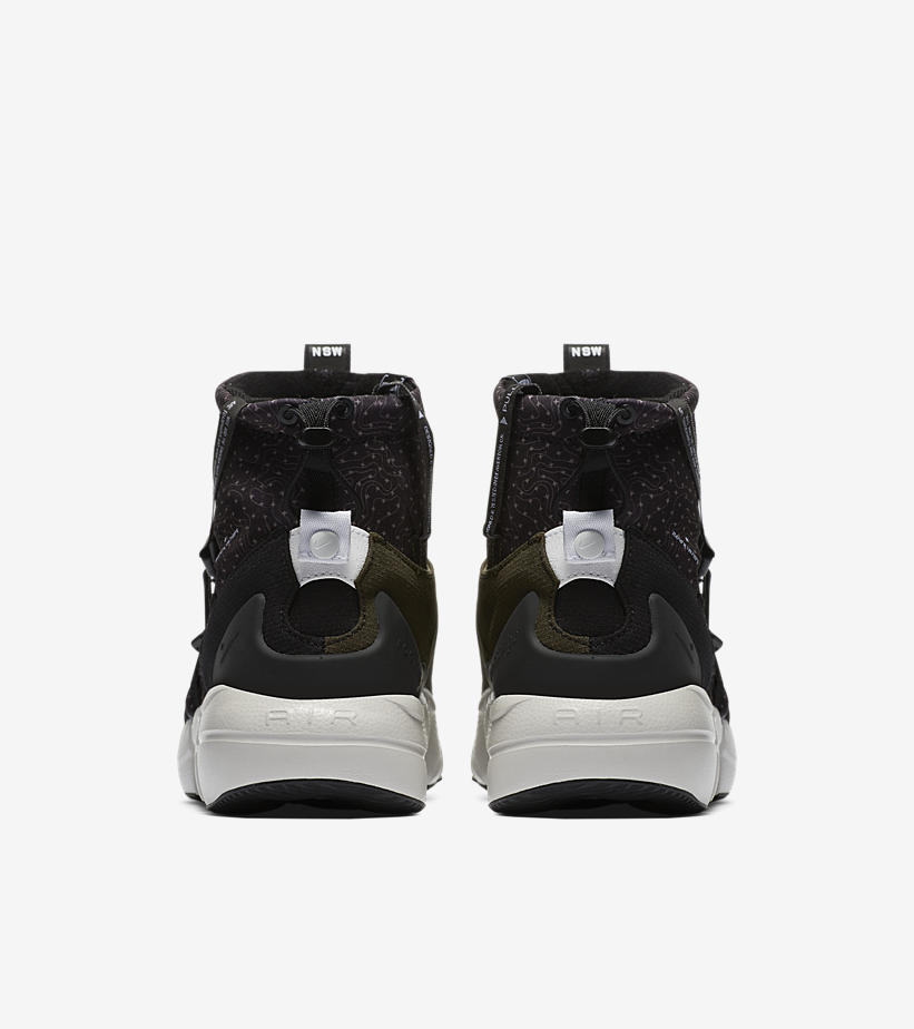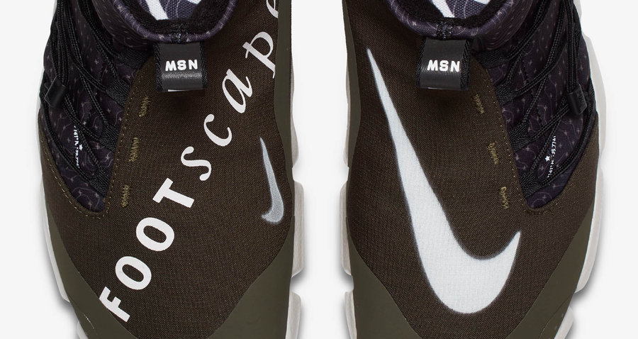 鞋款设计注重功能性与机能感,高帮袜套与醒目的 Swoosh Logo 则有一种 “吕布” 的既视感,鞋带系统使用鞋扣松紧收缩设计,左右脚以鸳鸯的设计呈现,首发的两款配色相对低调,分别为黑曜石与军绿色。