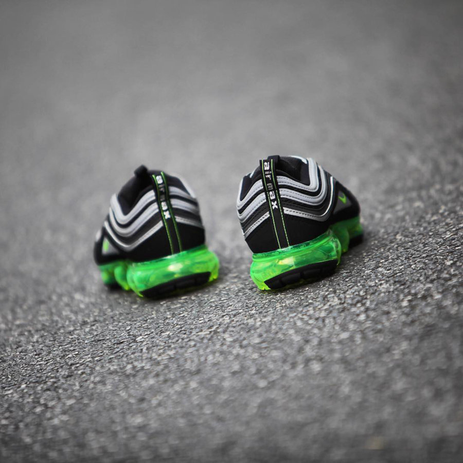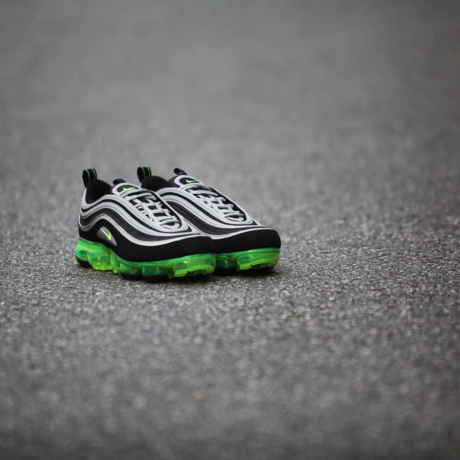 将 Air Max 97 的流线型鞋面嫁接在 VaporMax 鞋底上,重塑经典造型的同时,Air Max 97 独特的未来感又与 VaporMax 的科技感相得益彰。首款配色以灰黑鞋面搭配荧光绿鞋底,同时保留了 Air Max 97 标志性的 3M 反光条,风格复古又充满科技感。
