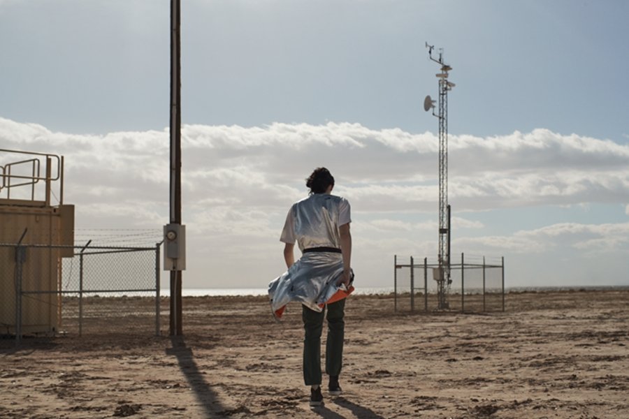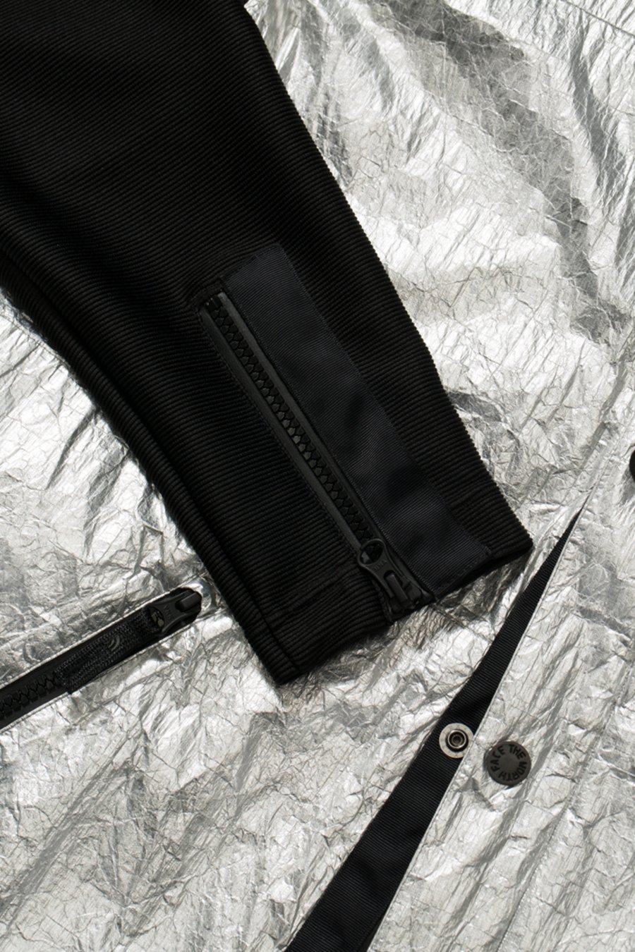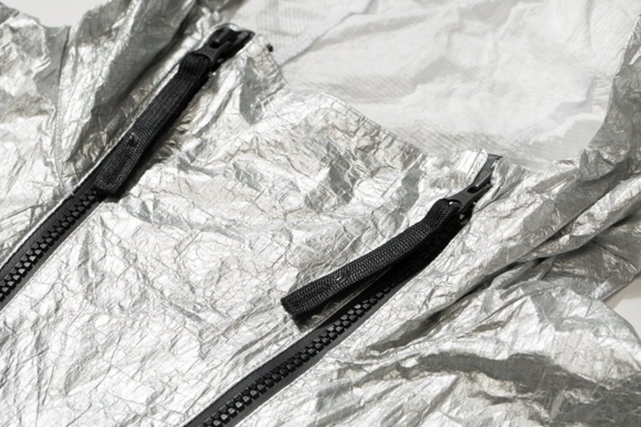 这种视觉上看起来像金属铝质感的醒目银色面料名为 Tyvek®,是一种集防风防水、轻盈、耐用、保护性高、抗污染和抗辐射多功能与一身的合成 Dupont™ 材料。