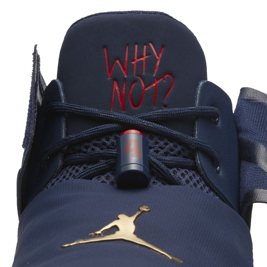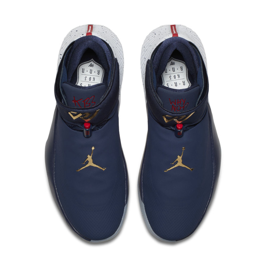 配色灵感来自于威少高中球衣,海军蓝鞋面配以灰水泥后跟稳定系统,并以金色和红色点缀。左右脚鞋舌分别印有 “Why Not” 和 “KB3” 字样,与威少佩戴的腕带相同,纪念他与 Khelcey Barrs 的友谊。