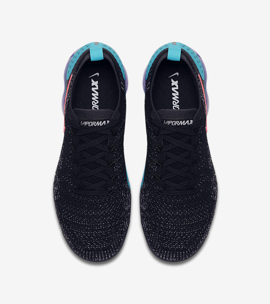 Nike Air VaporMax 2.0 依然承袭了标志性的大气垫和鞋身轮廓,后跟则加入了支撑包裹,Swoosh 也更为立体。男女款首发配色均为类似南海岸的黑蓝粉配色。