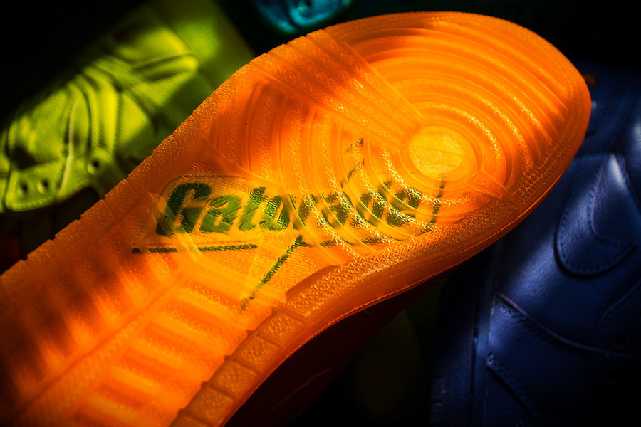 橙、蓝、紫、黄四色醒目呈现,鞋帮与水晶外底点缀佳得乐标志性的闪电 Logo,直击主题!