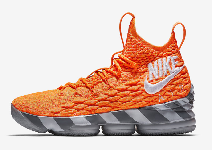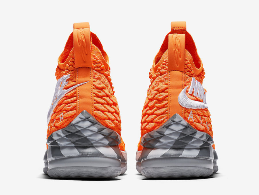 LeBron 15 “Orange Box” 灵感来自于 Nike 最初版的橙色鞋盒,以橙色编织鞋面搭配深浅灰交替的条纹中底,后跟外侧绣有经典的 Nike Air Logo。从詹皇上脚照看配色极为亮眼,刺绣 Logo 质感不俗,是 LeBron 15 极具个性的一款配色。
