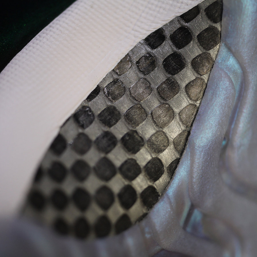 鞋款在平时更像是黑白配色的 “Concord”,而在光照下则显现出这双鞋本身的魅力,除了水晶外底会有珍珠般的光泽之外,鞋面上的漆皮也会呈现出深绿色如宝石般的光晕,质感非凡。