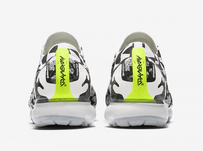 鞋面采用了黑白迷彩纹理,或许是源自军事迷彩涂装,鞋舌和后跟都采用了荧光色点缀,夺目效果非凡。