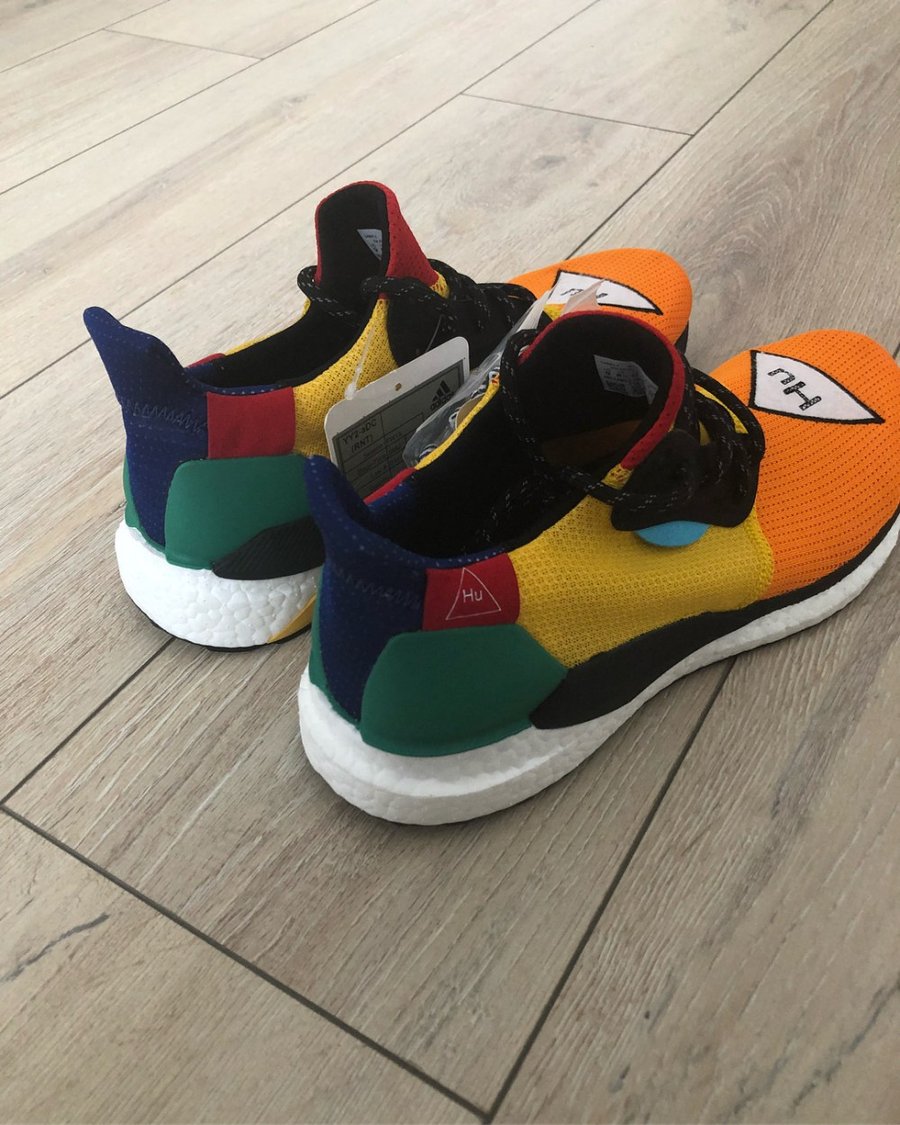 在这双全新鞋型中可以看到 UltraBoost 与 Energy Boost 中的设计元素,橙、黄、红、蓝、绿等多种颜色拼接打造的 Primeknit 编织鞋面,鞋头与后跟部位都有醒目的 “Hu” Logo 点缀,大胆奔放值得关注!