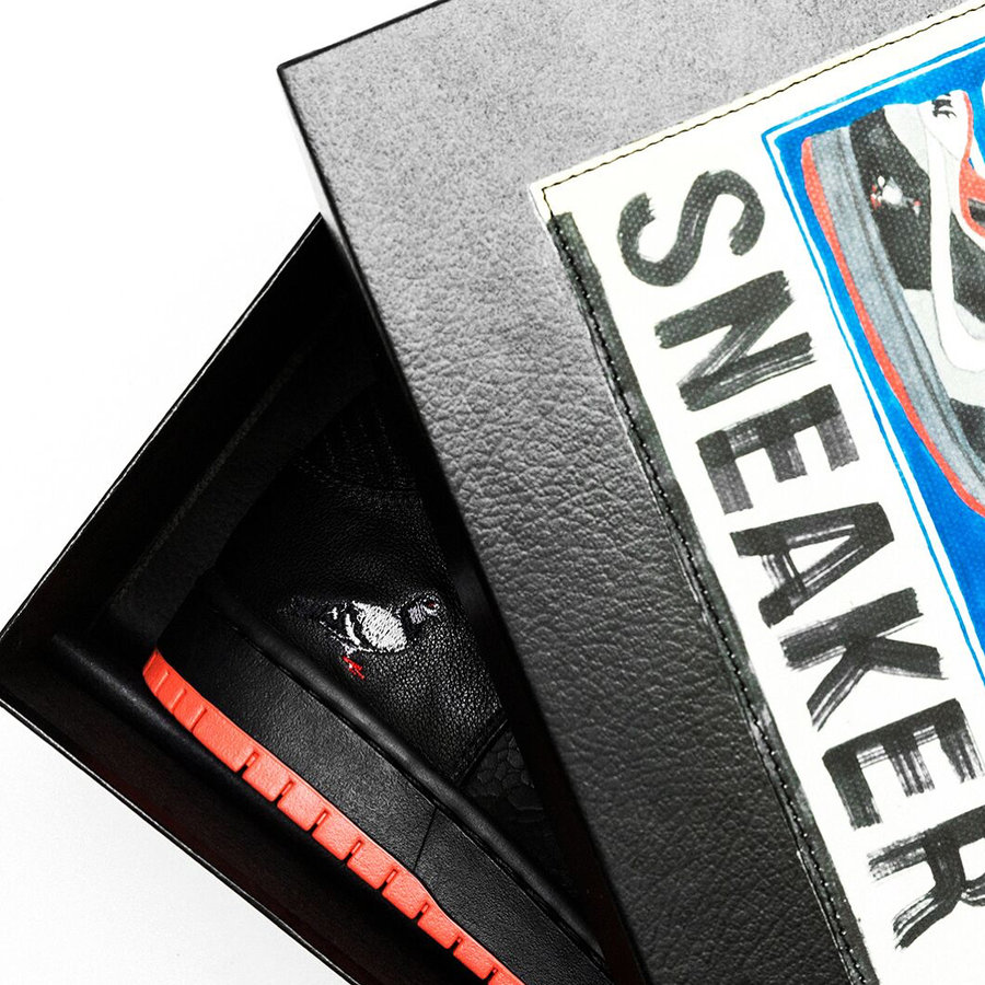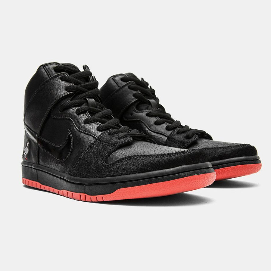 近日球鞋定制团队 @relevantcustoms 就以此为灵感带来一双定制版本,设计除了将鞋型改为高帮外,在材质的选择上也有不小的改变,黑色优质皮革打造鞋身,侧面还有蟒蛇皮纹理,鞋头部位则加入人工马毛,质感完全升级。