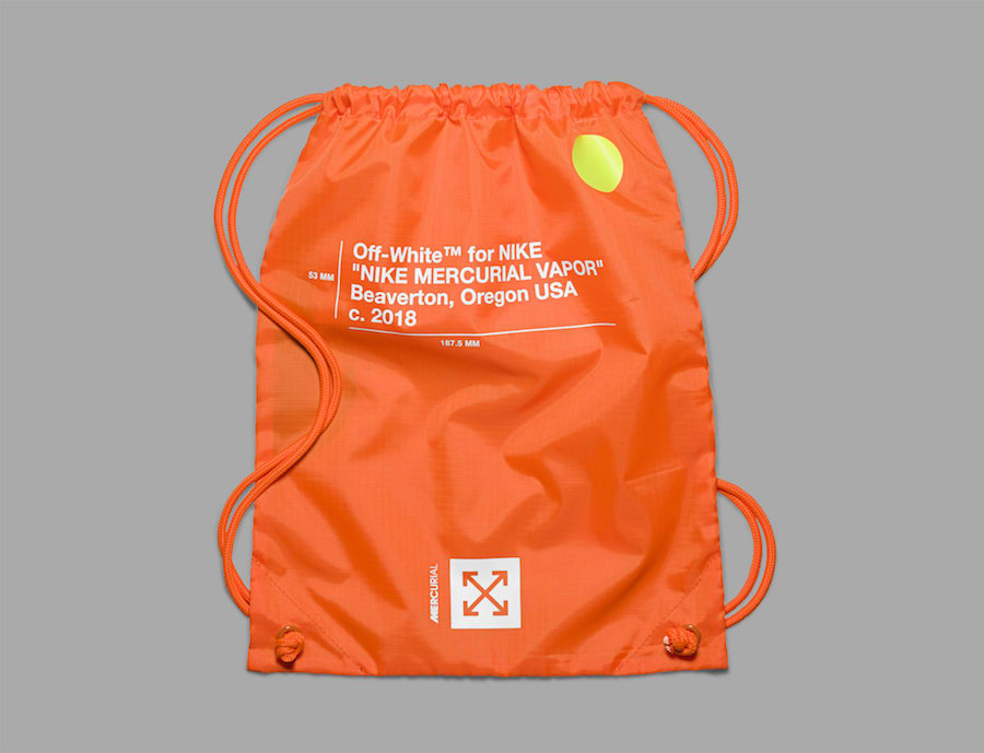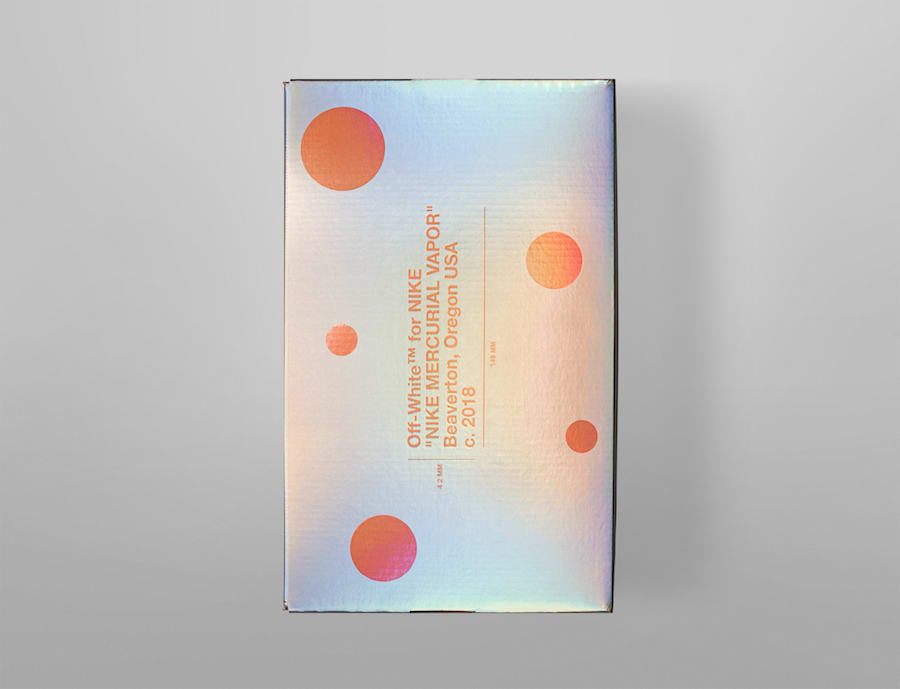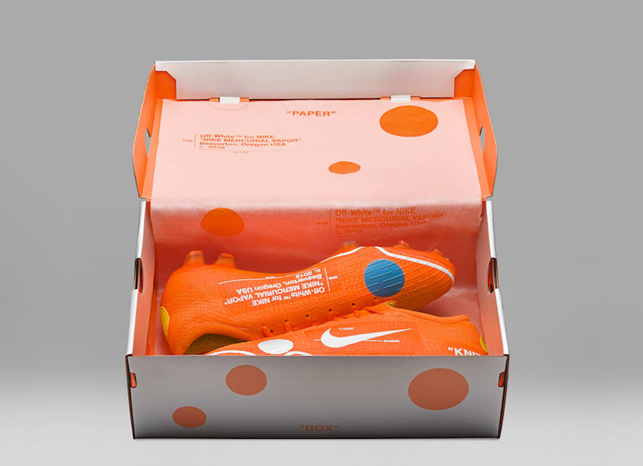 配色方案与之前 OFF-WHITE 主理人 Virgil Abloh 上脚过的 Mercurial Vapormax Hybrid 鞋款如出一辙,橙色主体配以白蓝两色的波点,同时保留了标志性的白色说明字体,Vapormax 中底则被替换为橙色半透明鞋钉,而在球鞋科技上更应用了最新的 360 度 Flyknit 编织技术。