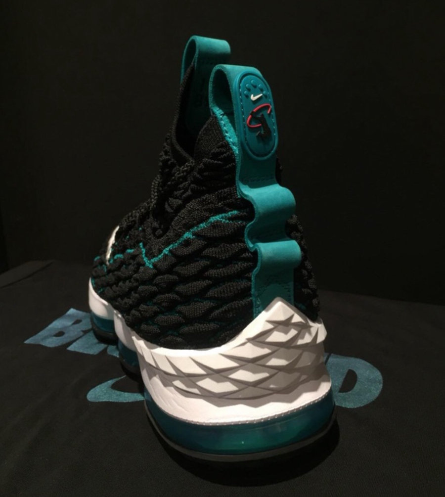 配色方案继承了 Air Griffey Max 1 经典的水绿色搭配黑色,为 LeBron 15 塑造独特复古气质。
