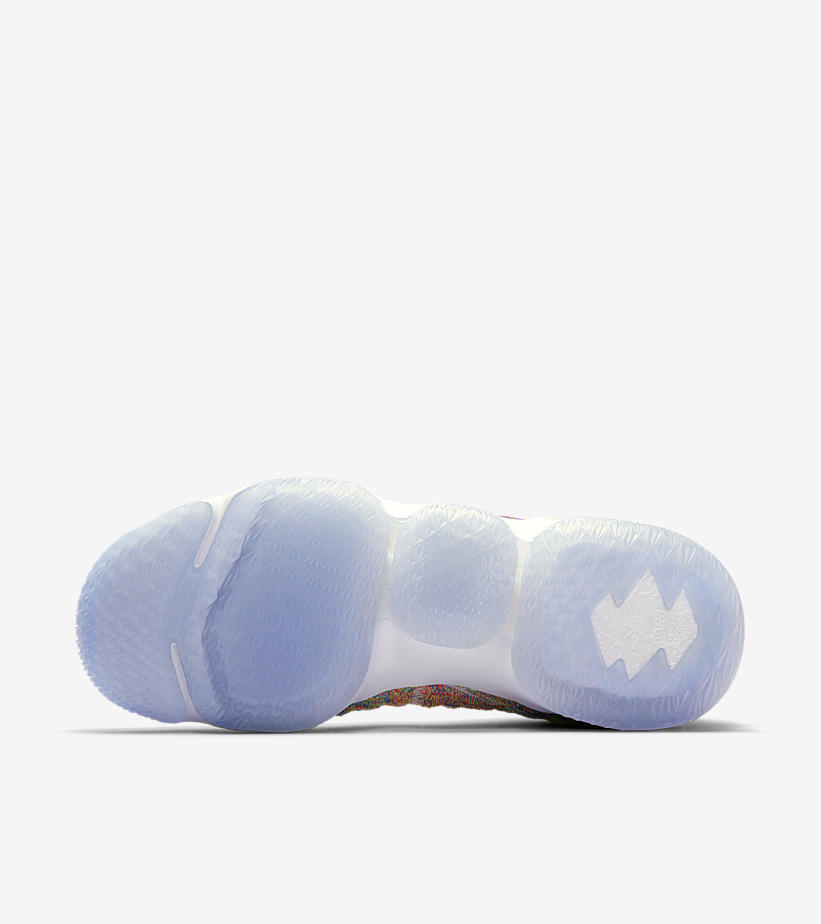 鞋款配色的灵感来源于 Fruity Pebbles 果味麦片缤纷的颜色,BattleKnit 编织鞋身更加细腻的呈现五彩斑斓的水果色气氛,标志性的后跟稳定片特别以透明材质呈现,搭配冰蓝水晶外底,颇为诱人。