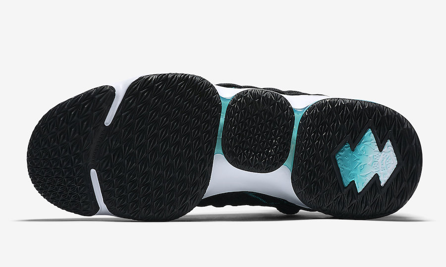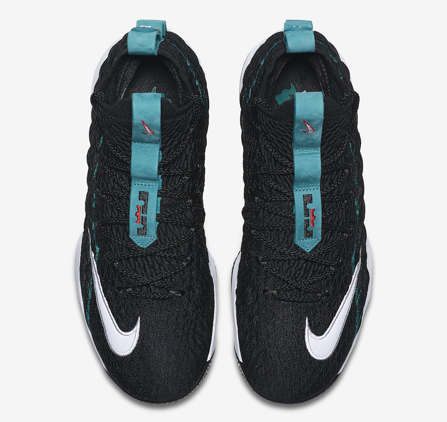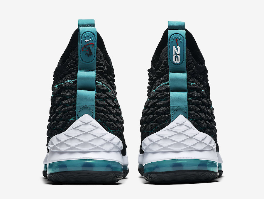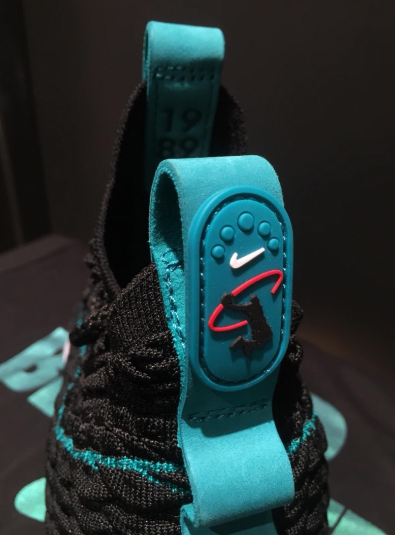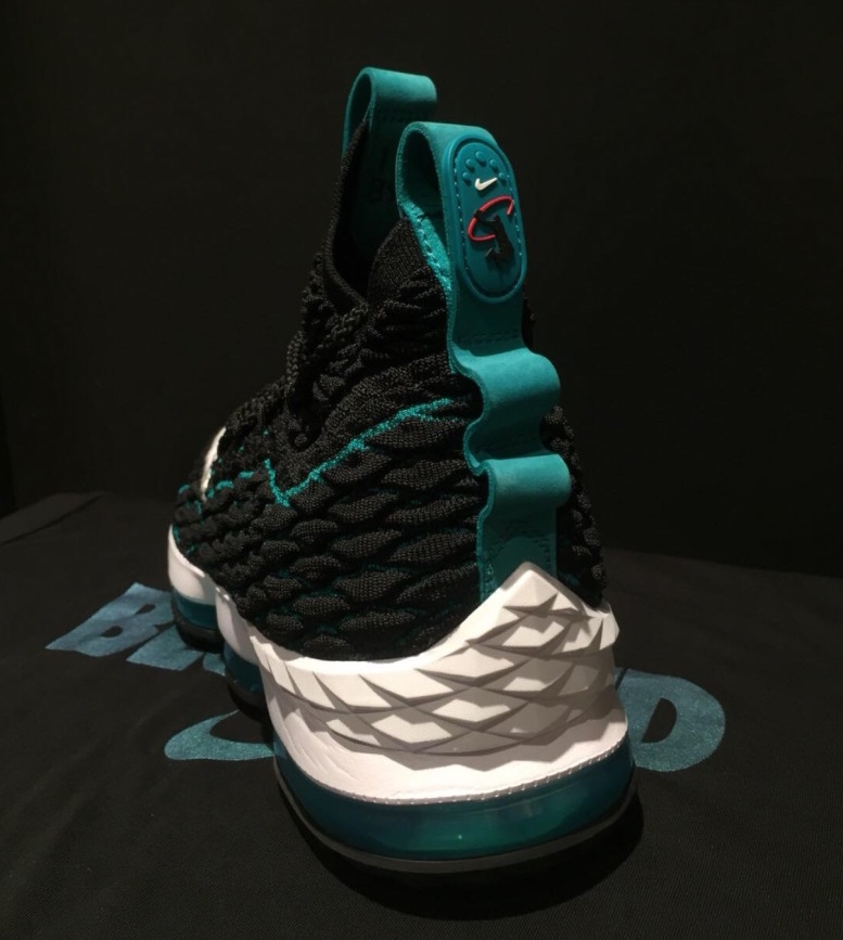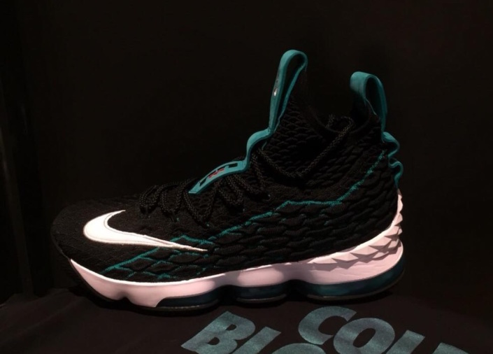 鞋身采用黑搭配湖蓝的配色方案,以棒球手 Ken Griffey Jr 签名鞋 Air Griffey Max 1 为灵感,在 LBJ15 的鞋头处添加白色 Swoosh Logo,鞋提标志融合 Griffey 的挥棒 Logo 和 LeBron 的 Dunkman Logo。