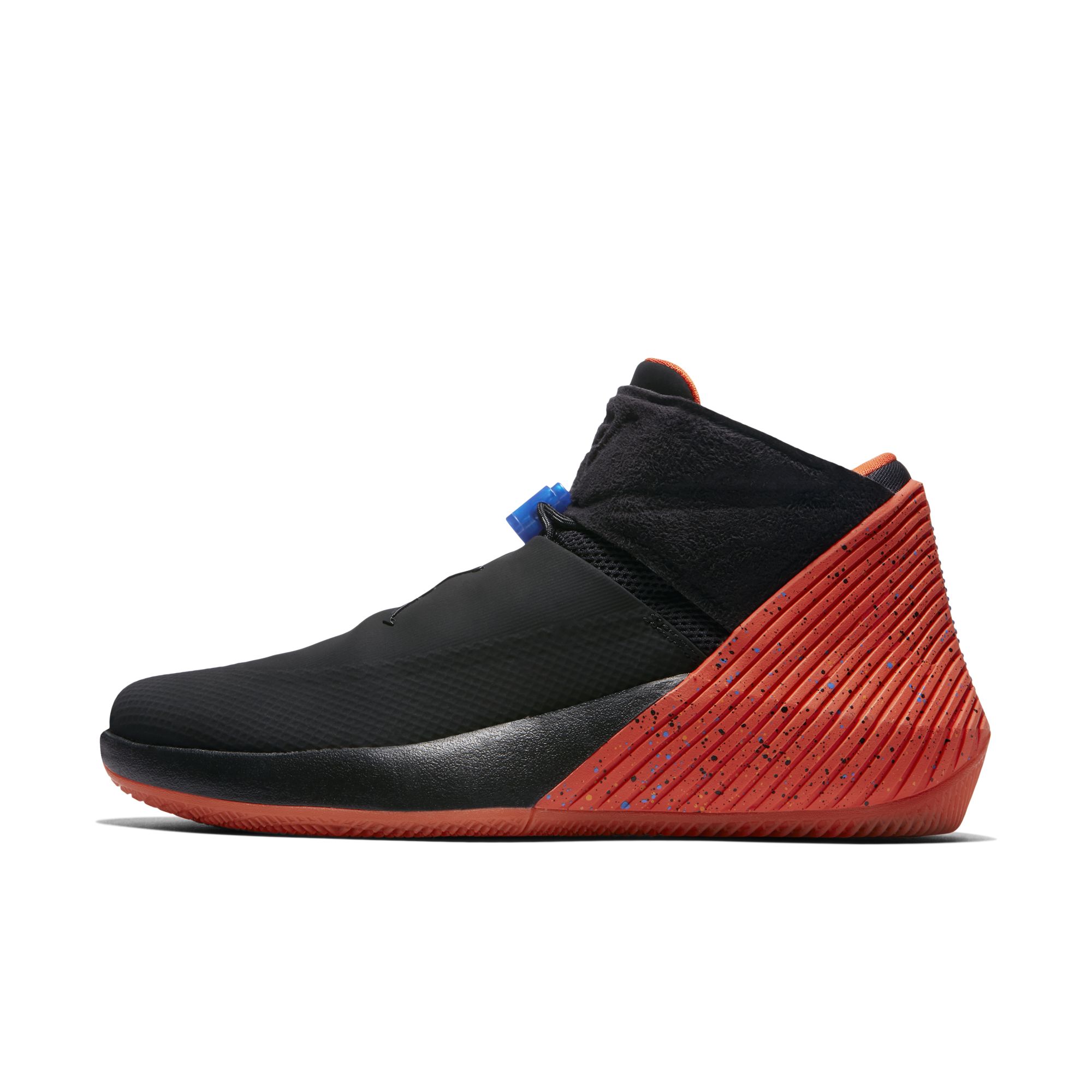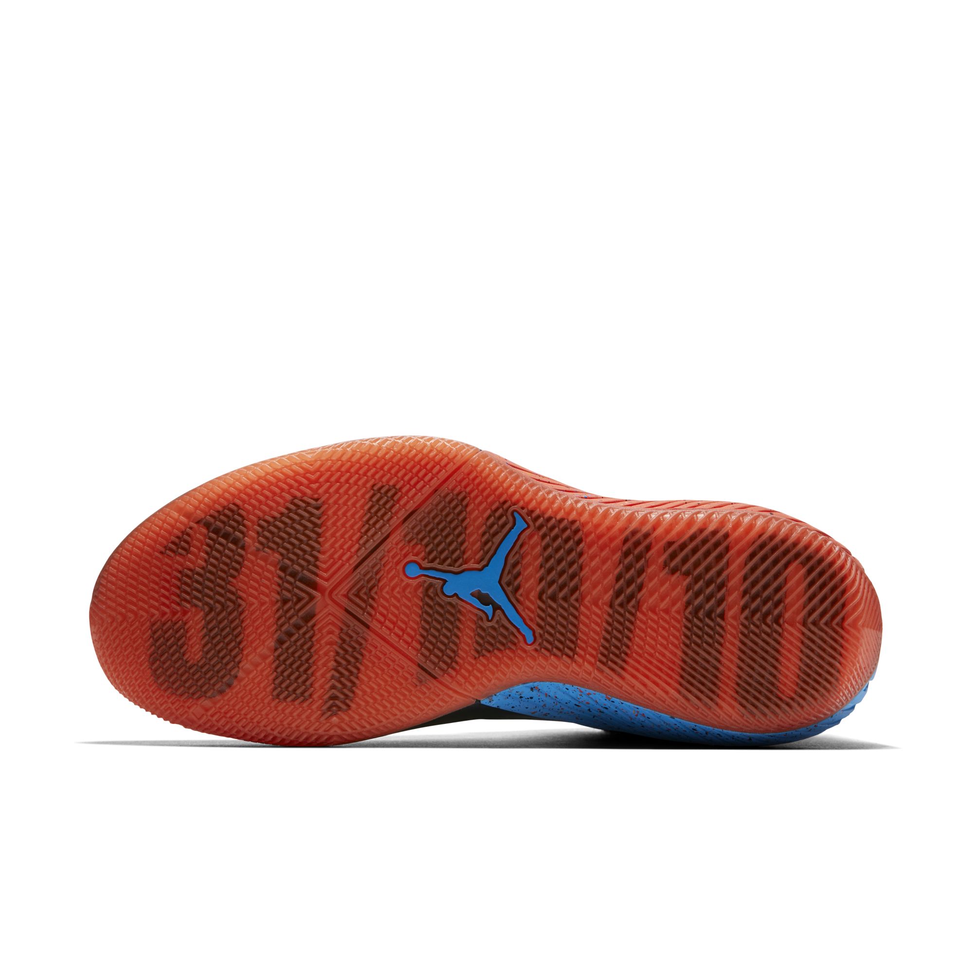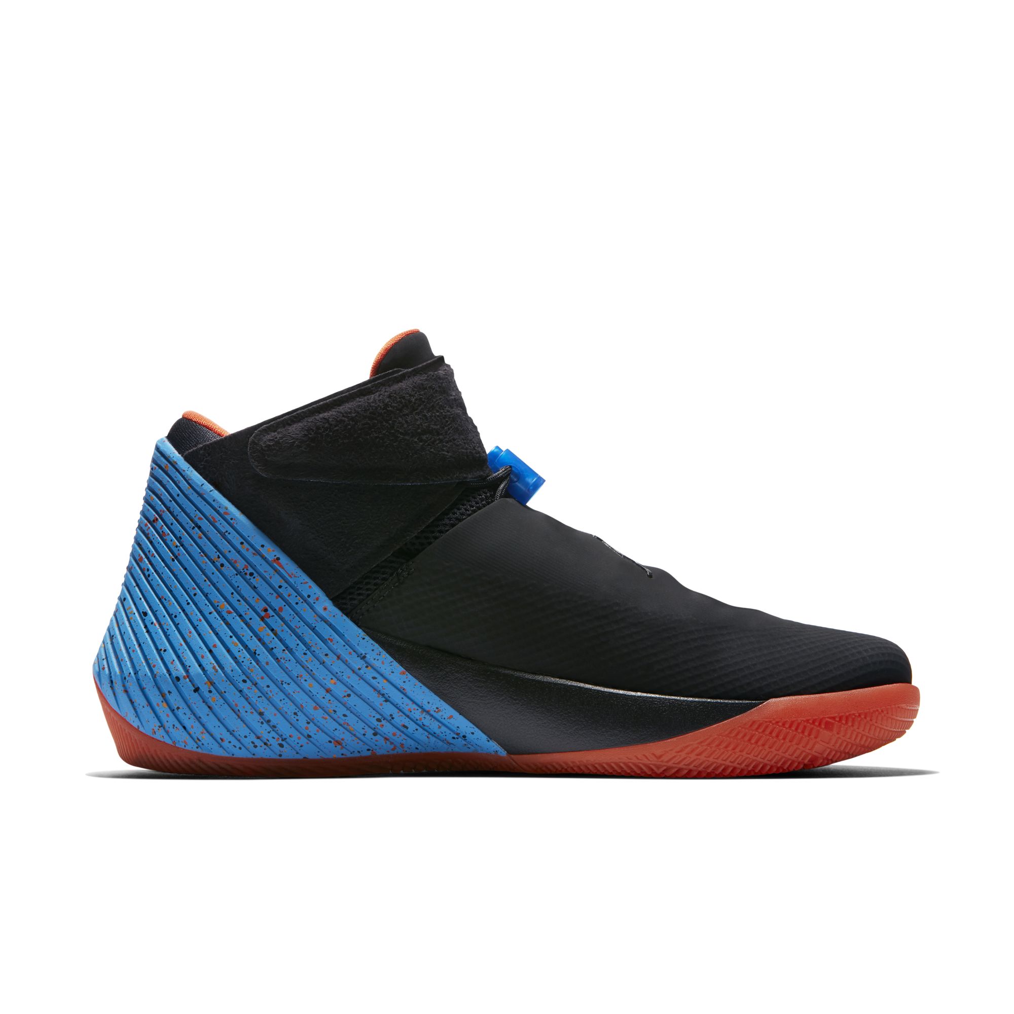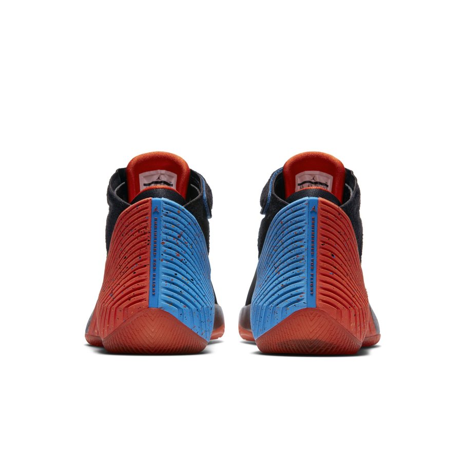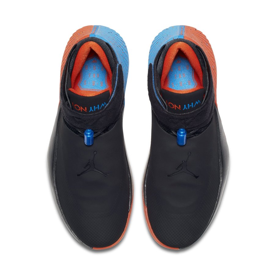 鞋面采用低调的黑色进行渲染,独特后跟分别用雷霆队的标志性蓝色与橙色进行渲染,并配有喷墨效果进行加持!