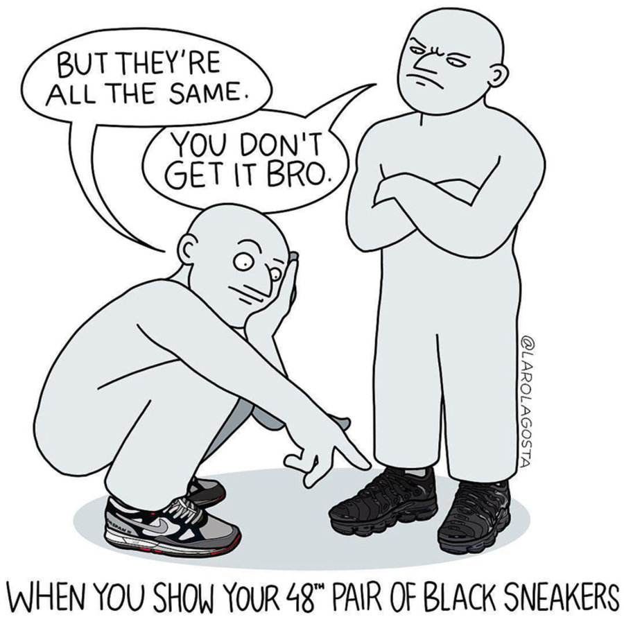 常见于对某款鞋型或某个配色十分执着的鞋头。在父母或者不玩鞋的朋友看来,颜色相同的鞋基本是没有区别的,也没有必要为了不同配色而买多双同款。