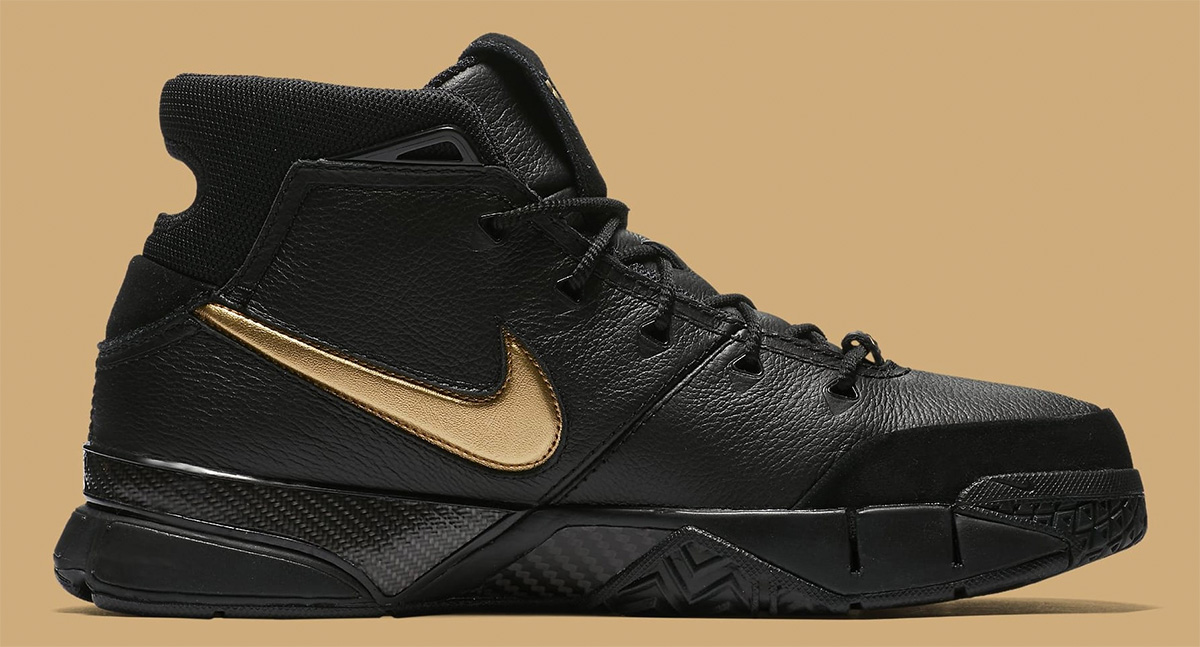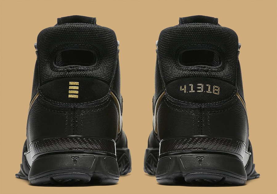 这款 Kobe 1 Protro “Mamba Day” 以黑色皮革鞋身搭配金色和碳纤维细节,质感不凡。后跟带有四条疤痕标志和 4.13.18 字样,表明了它 Mamba Day 的主题。