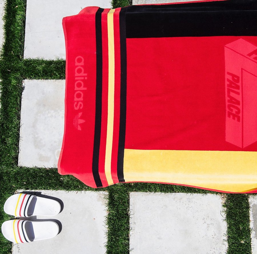 PALACE x adidas Originals 2018 春夏联名系列将于 4 月 27 日,也就是本周五正式上架。目前公布的单品仅有德国国旗配色的拖鞋以及沙滩巾,不过根据此前的预告来看,还会有 T恤和短裤一并登场。