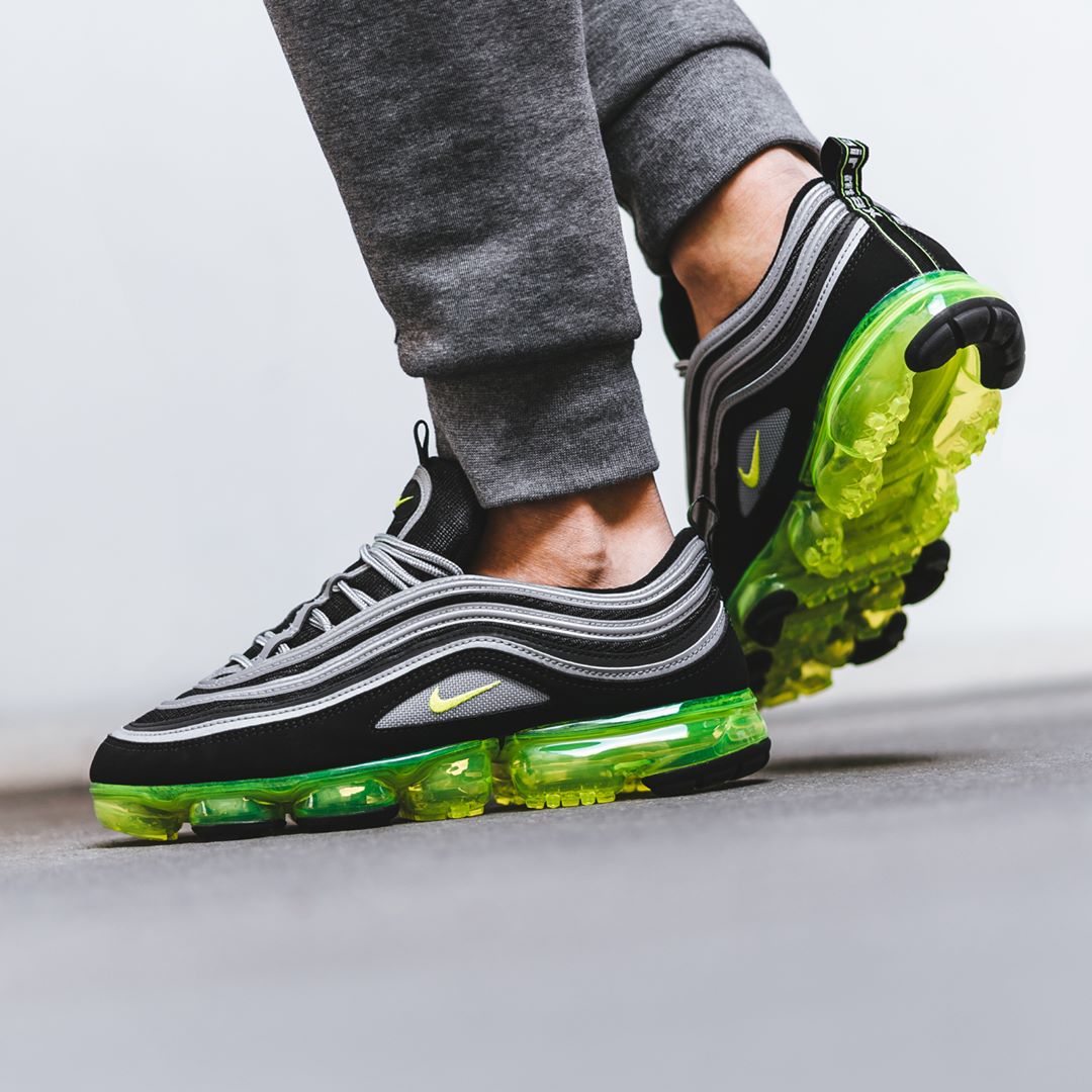 这款 Nike Air VaporMax 97 “Japan” (货号 AJ7291-001)以黑灰鞋身搭配荧光绿鞋底,劲酷风范十足。