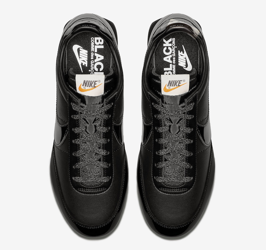 此次联名以经典复古鞋款 Night Track 为原型,黑色作为主调,在优质皮革鞋面的基础上,鞋头、后跟及 Swoosh 部分加入漆皮点缀,后跟印有的白色 “CDG” 彰显联名身份,平滑的水晶外底则有白色斑点装饰,将这双鞋打造成奢华感十足的时尚单品。