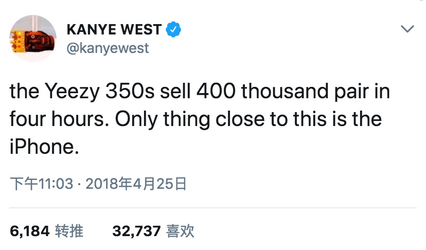 他还说:“Yeezy 350 在 4 小时内卖出 40W 双,只有 iPhone 有这么疯狂的销售数据”。
