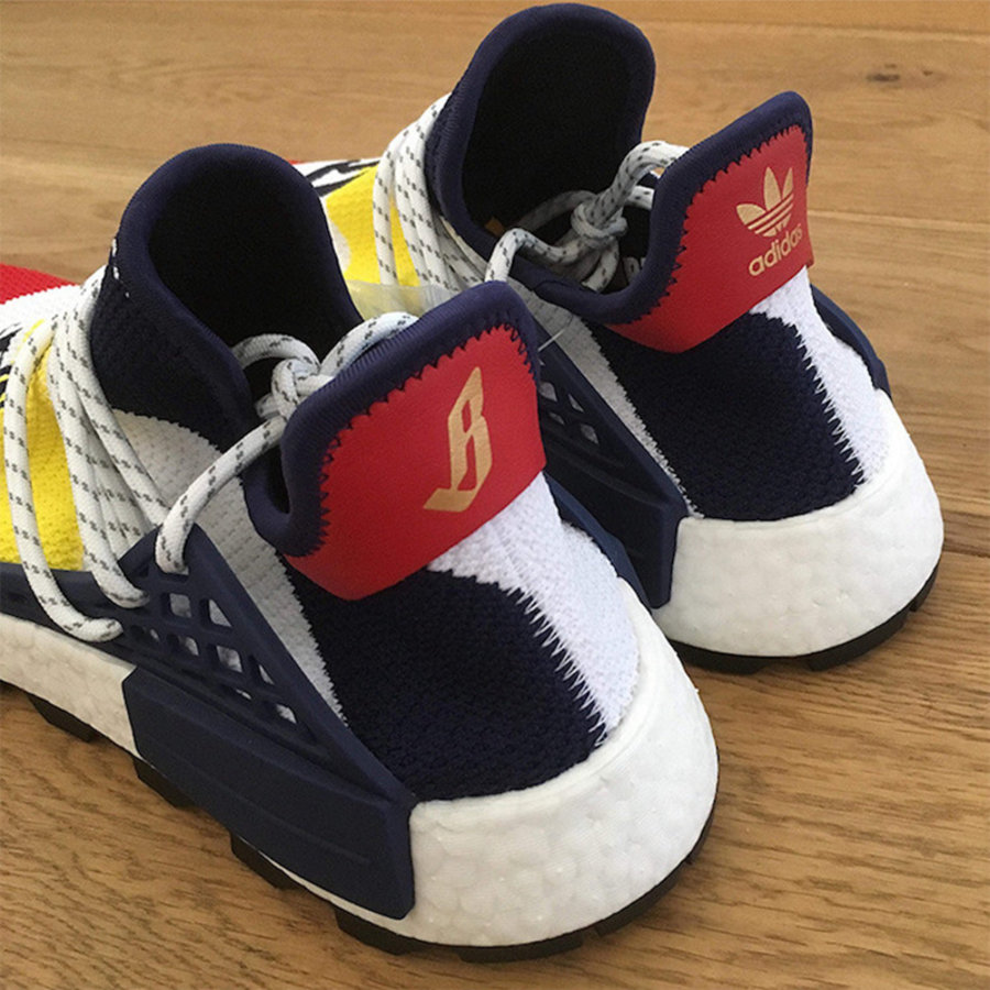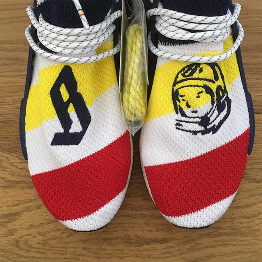 配色方案与 Sample 完全相同,白、红、黄、蓝四色条纹装扮。Sample 中藏于后跟的 “B” 字体和宇航员刺绣 Logo 被转移到了脚背处,并以更大面积呈现,延续了菲董 Hu NMD 系列浮夸刺绣的风格。