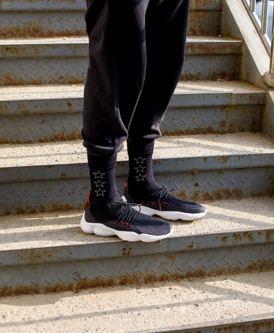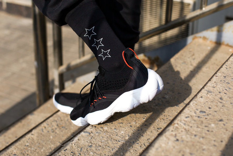 鞋面选用当下流行的编织袜套设计,同时融入多种物料材质打造。鞋领及脚背为弹性编织材质,穿脱方便贴合脚型,同时搭配大网孔织法,透气性更为出众。