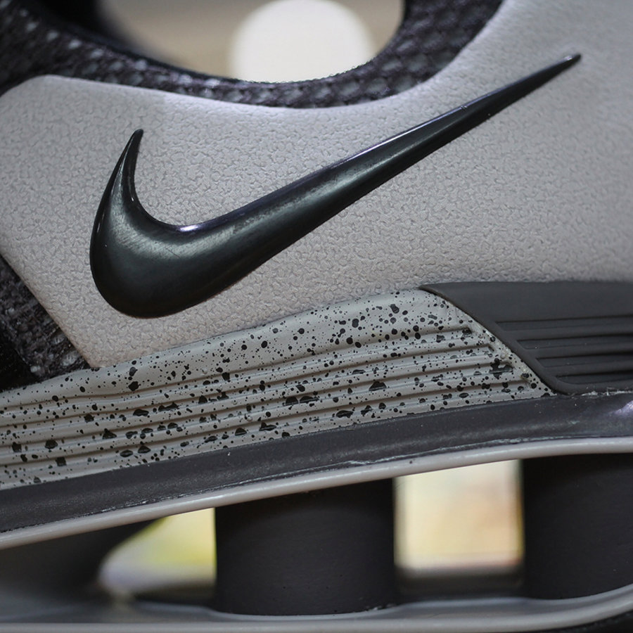 以灰黑色为主色调,鞋面为轻透网布材质,以织物绑带补强,后跟处还有环绕 TPU 稳定模块增强安全性。后跟搭载经典四柱 Shox 科技,重新调校的 Shox 脚感明显,能够轻易踩出形变并且回弹强劲。