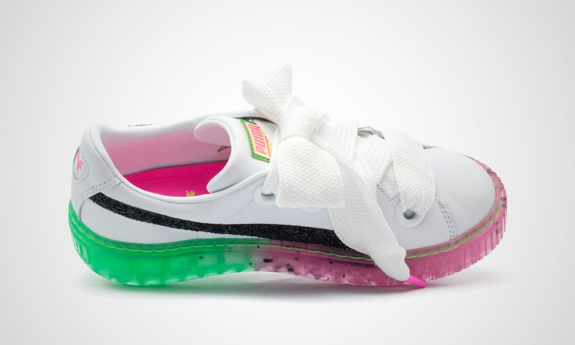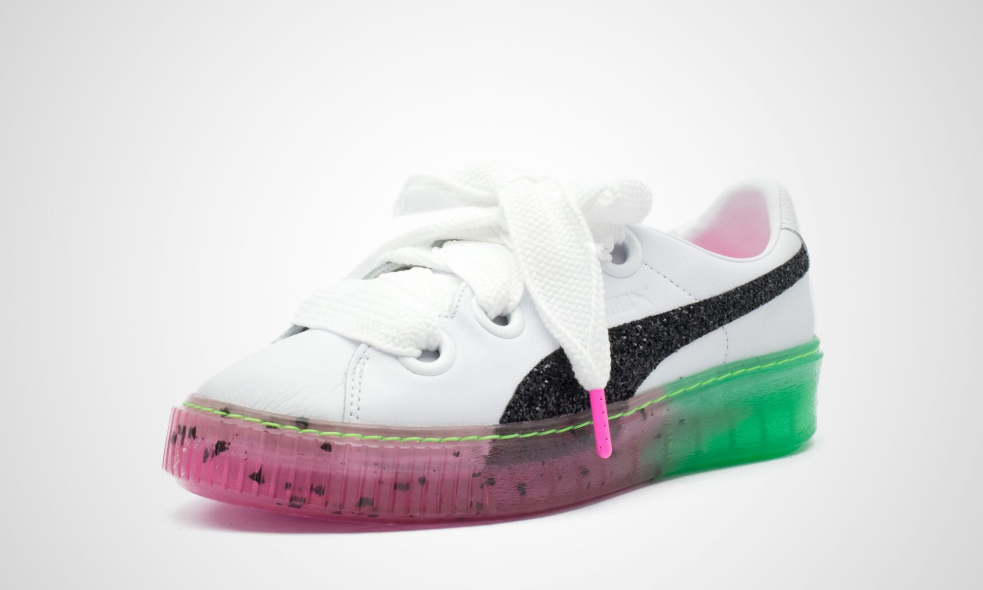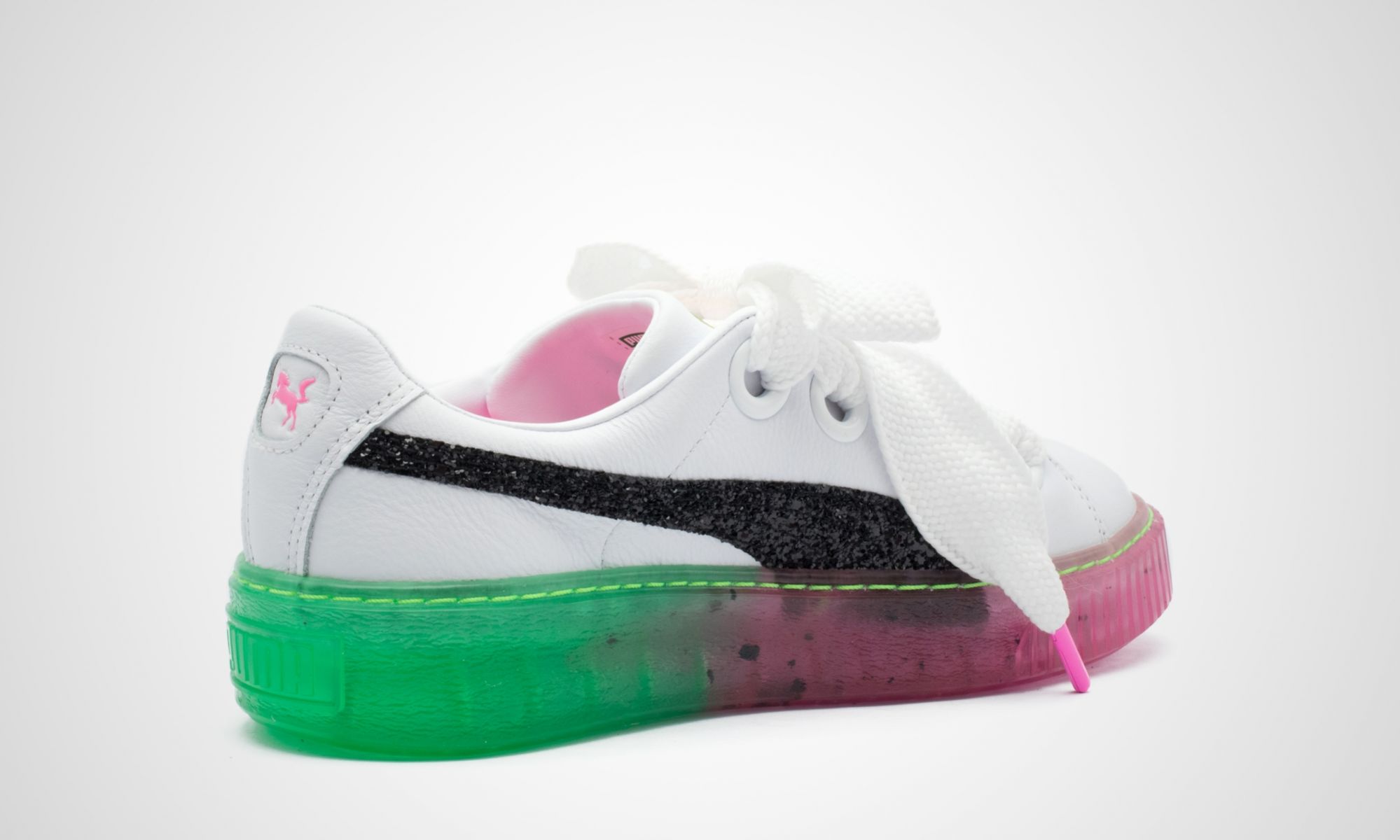 即将发售的这款 Puma x Sophia Webster Platform Candy Princess,亮片材质营造的鞋身标志与粉绿果冻大底相呼应,辅以后跟粉红独角兽点缀,甜美气息呼之欲出,让人心动不已!