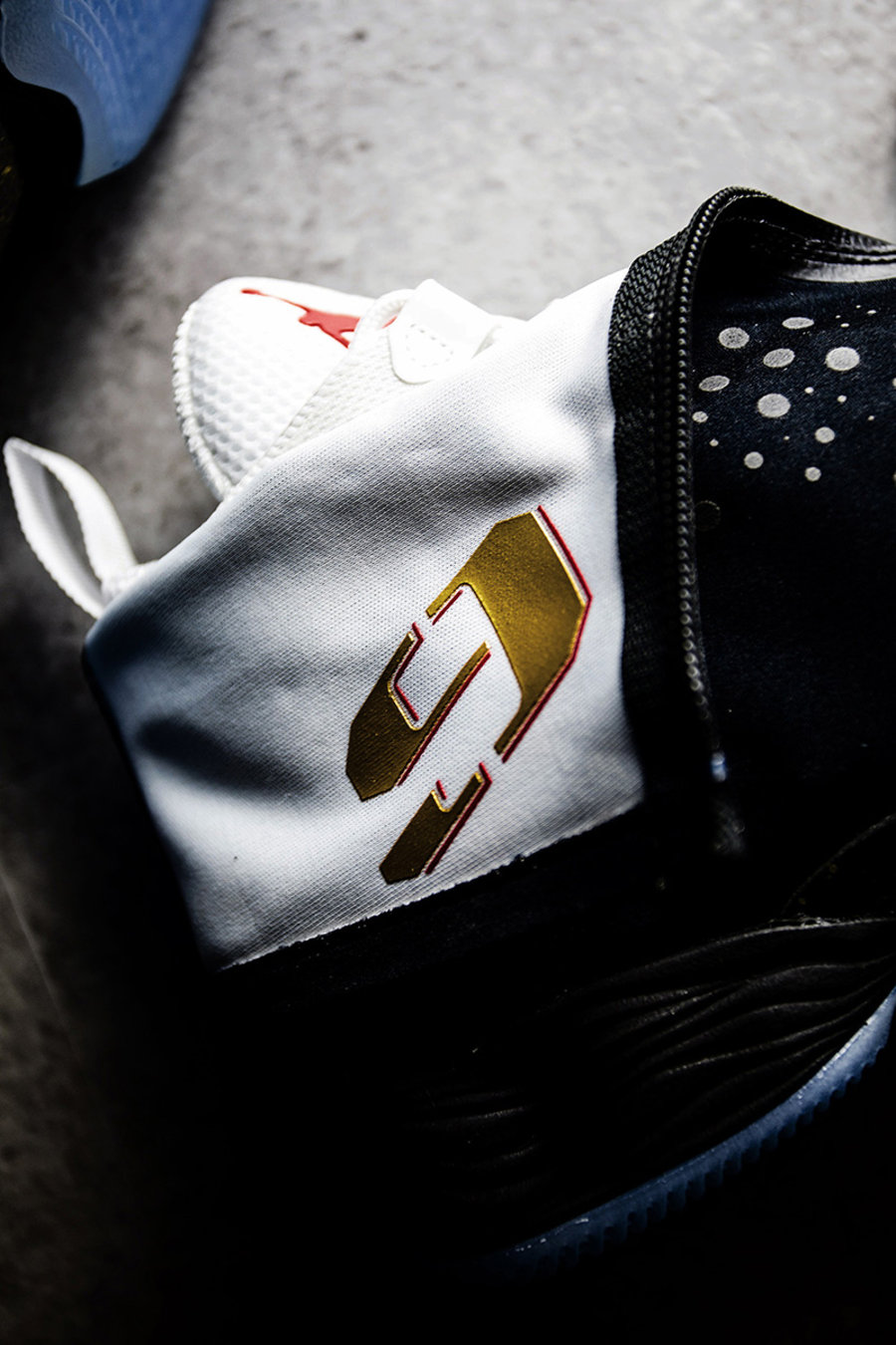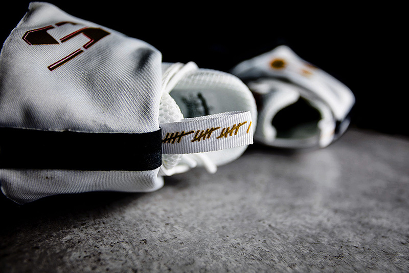鞋身外黑内白并有金色点缀,黑色的外靴翻过来,左右脚鞋面分别印有 “9” 和 “5” 字体,象征着最终 95 分战胜马刺队。白色的内靴的鞋提处带有 Champions Think 16 Collection 的专属印记。