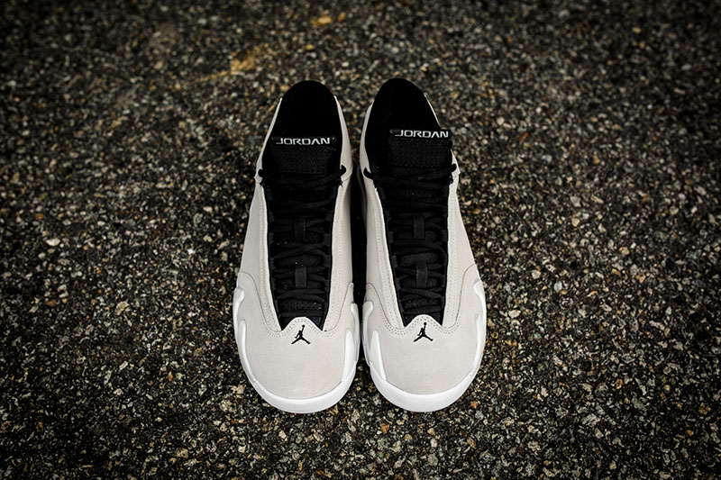 鞋身与传统 AJ14 不同,取消两侧繁复的车线及冲孔设计,辅以整张沙色麂皮打造,设计简约,质感不俗。依旧保留棱形中底稳定片及法拉利装扮的飞人标志,后跟加入橙红点缀,跑车灵感依稀可见。