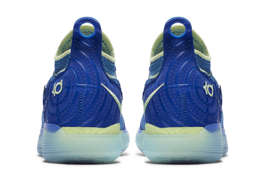 在外形设计上,KD11 与 KD10 有着不小的改变,中帮袜套式的鞋面,鞋身外侧的 Swoosh 缩小,中底与冰蓝色水晶外底相结合,曝光的两款配色分别以蓝色与深灰色为主调。