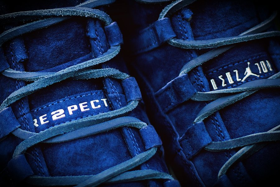 鞋身采用质感出众的蓝色麂皮打造,Air Jordan 11 传统的鞋舌中段刺绣,改为压印方式呈现,并在右脚以 “RE2PECT” 字样点缀。