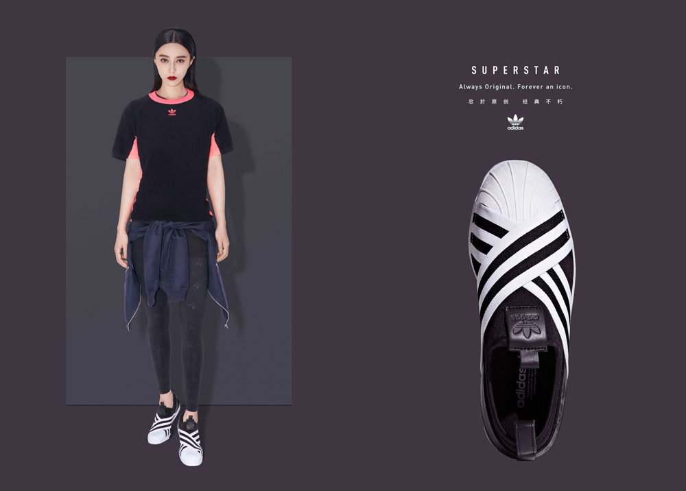 范冰冰穿上了全新配色 Superstar Slip-On,一身搭配突出运动女神的气质,深色系低调又不乏亮点,短袖与腰间的外套充满层次感,而脚上的 Superstar Slip-On 成为点睛之笔。