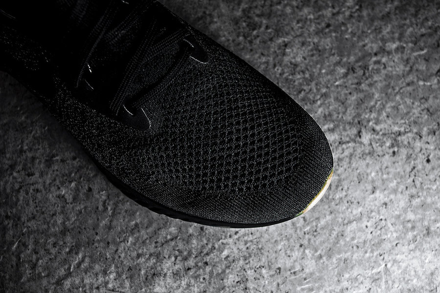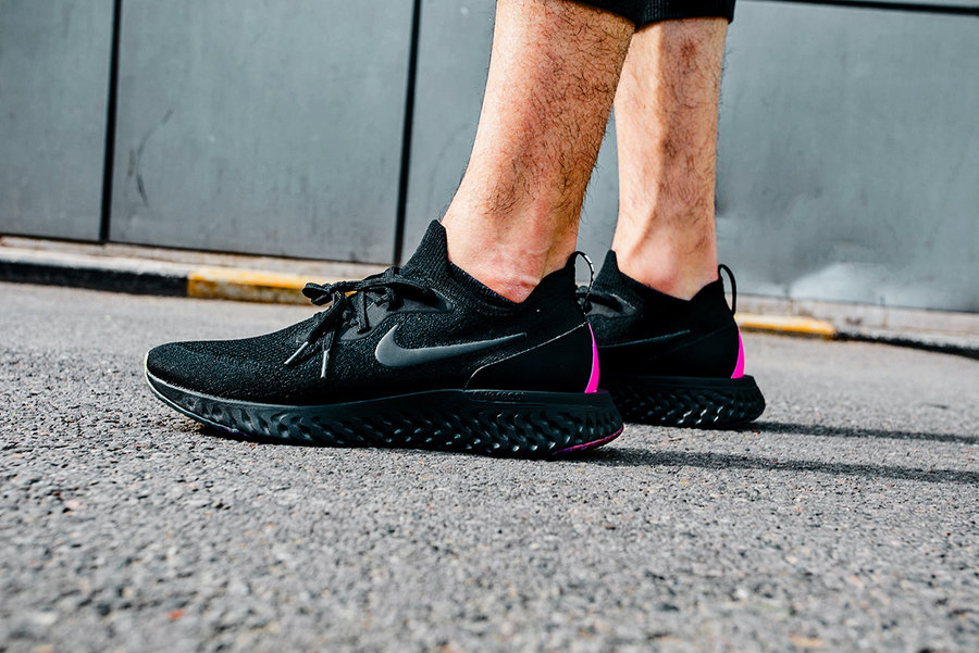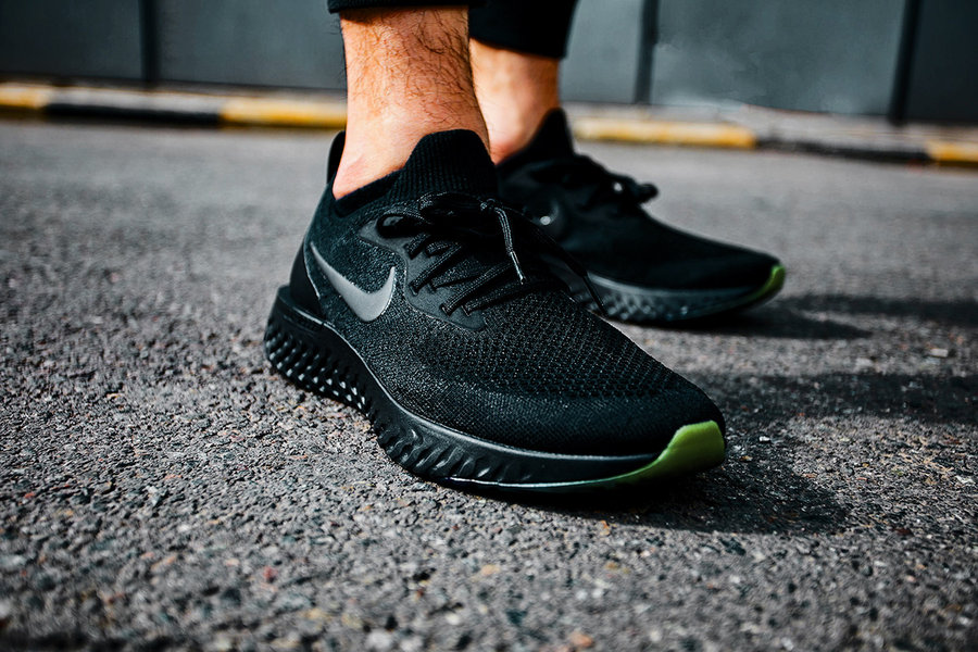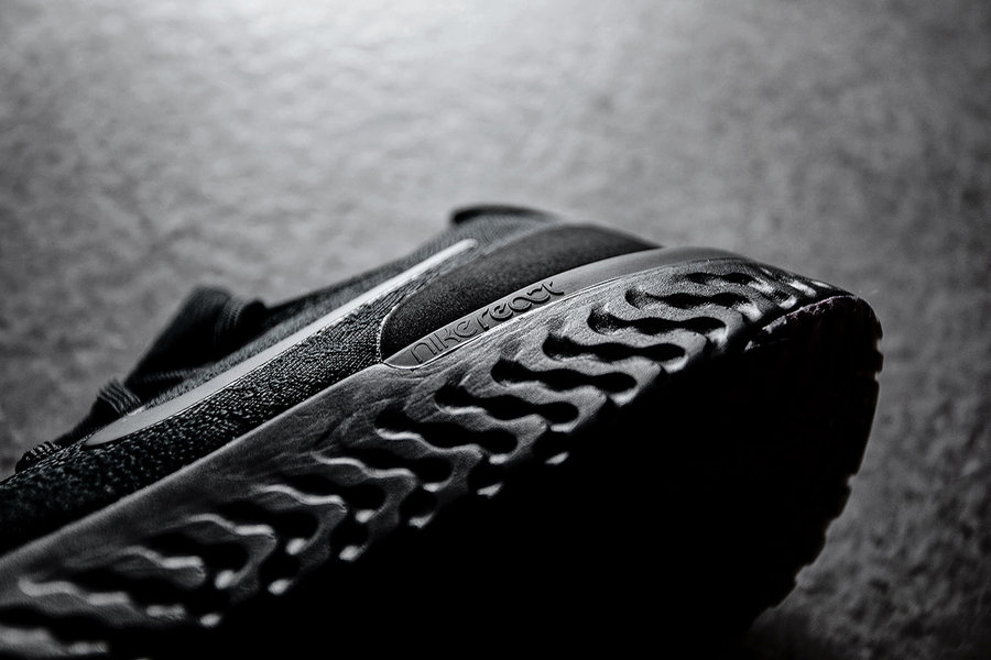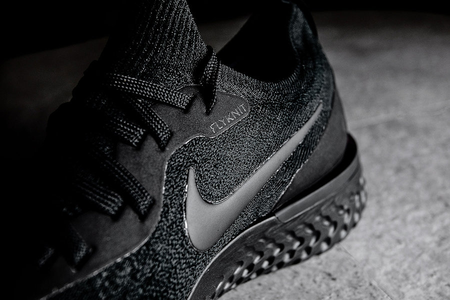 这双 Nike Epic React Flyknit 鞋身采用全黑色 Flyknit 材质编织而成,而中底的 Nike React 缓震科技也首次采用黑色进行渲染,整体效果低调并且百搭,犹如暗黑骑士一般。