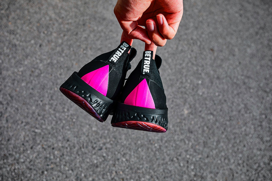 除了低调的整体,鞋身也不缺乏亮点,后跟支撑处选用粉色涂抹出三角形状,在提环位置印有 “BETRUE” 字样,而橡胶外底的彩色渐变效果,可以说是美到惊叹令人称赞!